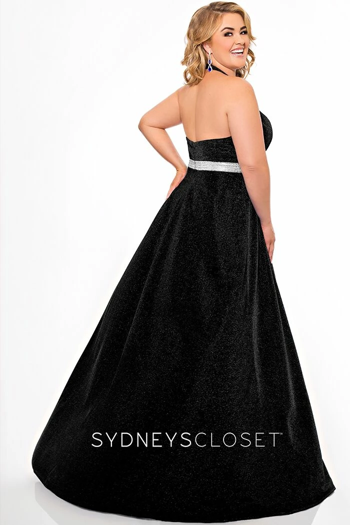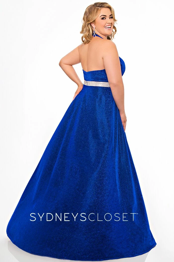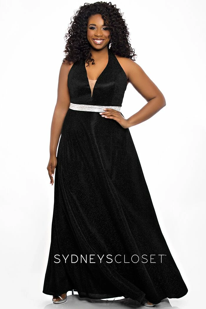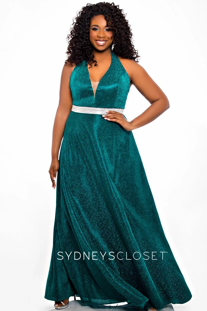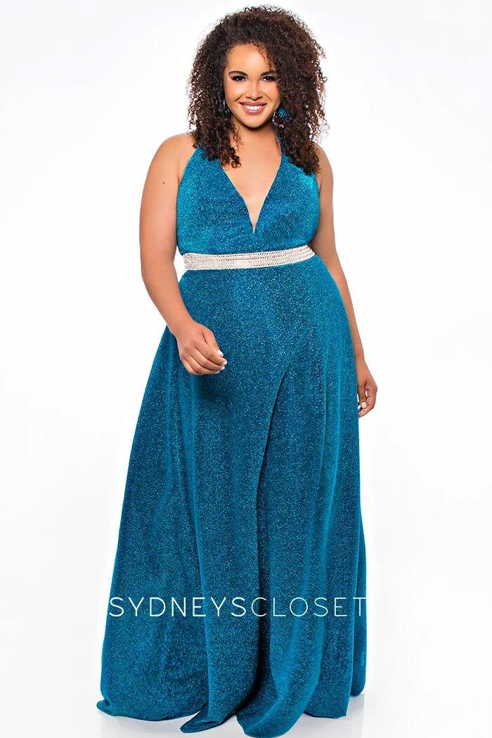 Sydney’s Closet SC7289 Plunging V neckline with mesh panel embellished belt long a line shimmer prom dress plus sized formal evening gown with side slit SC 7289