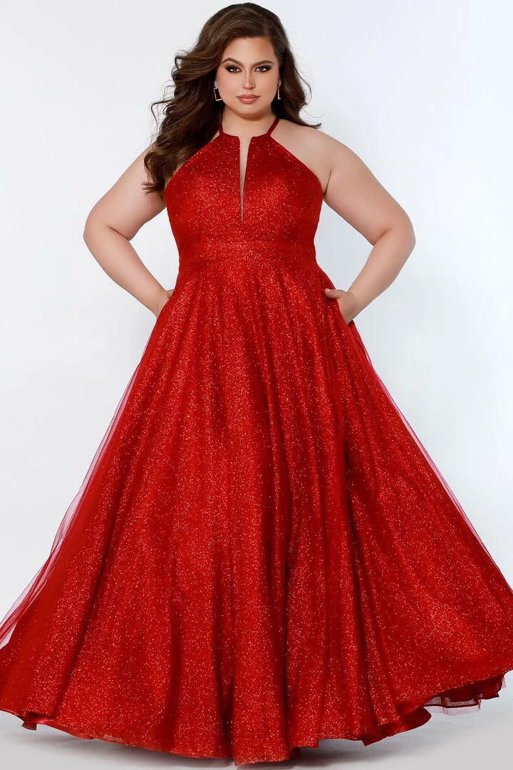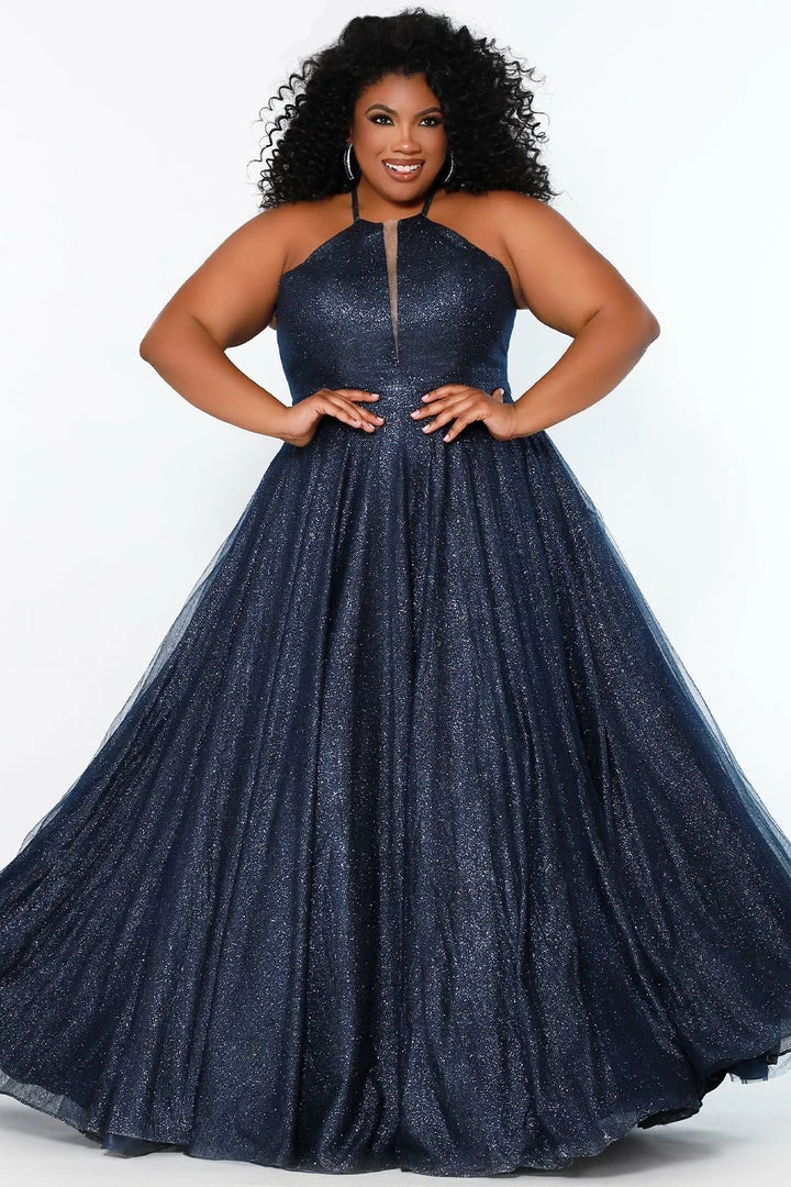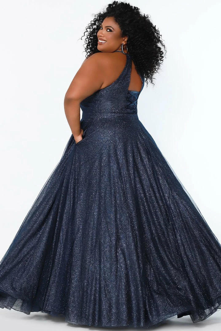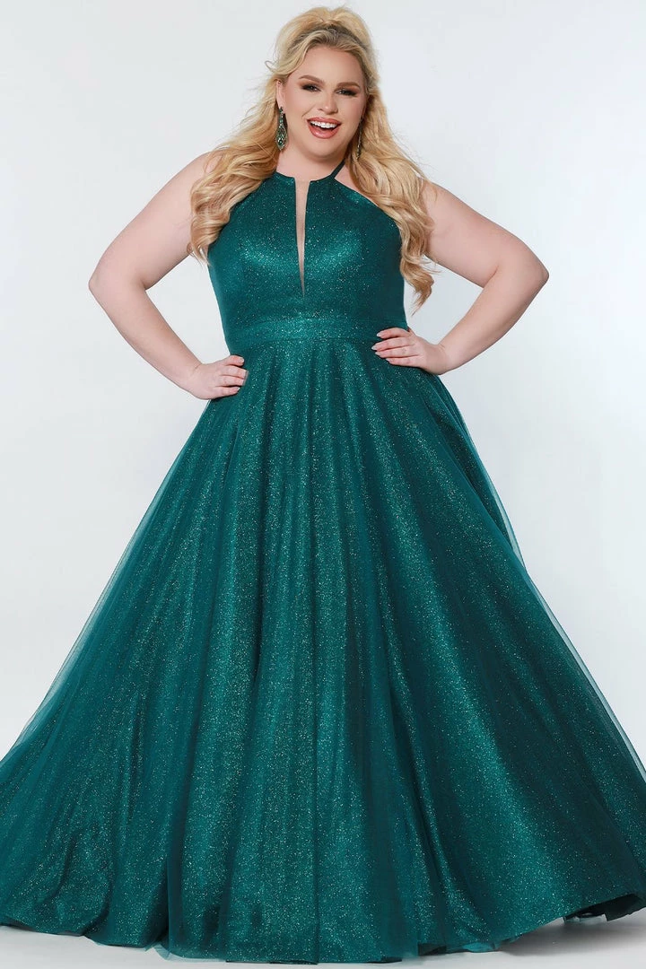 Sydney’s Closet SC7323 This Halter neckline Prom Dress is flirty with a deep-v nude mesh insert, and the detail continues on the bodice to a lace-up back with modesty panel. Layered glitter tulle sparkles in shades of Admiral, Evergreen, and Firecracker. Highlight your figure with the emphasized waistband, and flow into a fun a line Style: skirt with crinoline. SC 7323