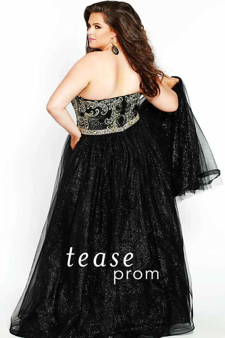 Tease Prom by Sydney’s Closet TE1801Â Look as gorgeous coming as going at this Prom 2018 in this sleeveless ballgown that splashes sparkle tulle over satin. This floor length silhouette design has a sweetheart, strapless neckline with gold embroidered bodice with sequins. The gown is fully lined, and finished off with a horsehair hemline. You’ll like how the natural waist line flatters your body. Available in black, red or royal blue. This gown’s center-back zipper makes it easy to get in and out of, although you won’t be eager to take it off after you get so many compliments! Prom Dress, Plus Size Formal. A Line Ballgown Glitter tulle skirt.