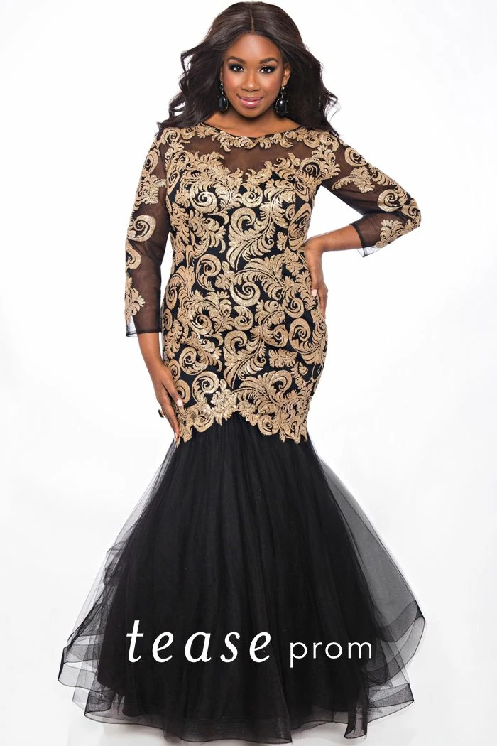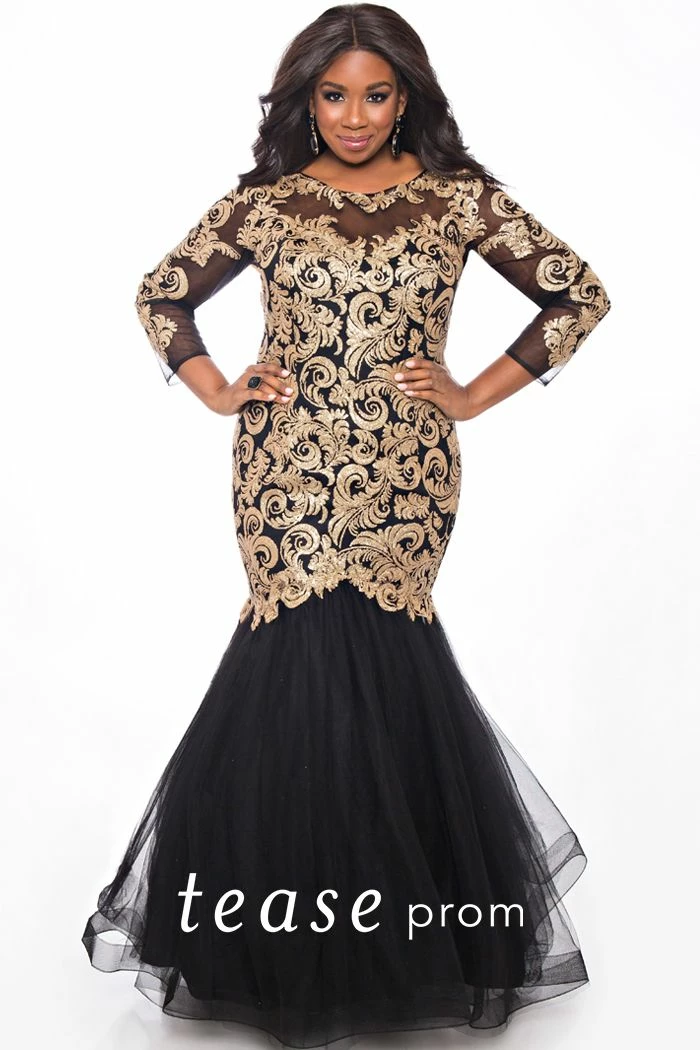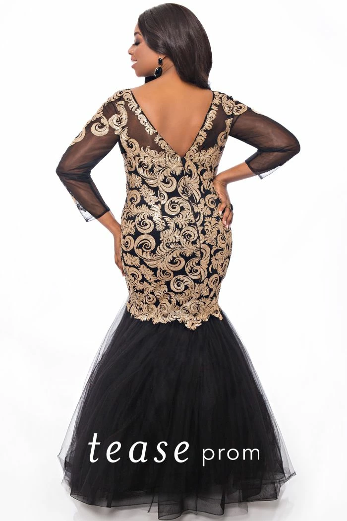 Tease Prom TE2022 size 16 Black Gold fitted long sleeve mermaid prom dress plus sized evening gown. This fit and flare silhouette dress in a dramatic black and gold design will surely create sparks at Prom 2021. From its heavily embroidered bodice to its fitted tulle fabric skirt, this dress works the scene along with you. Sequins and embroidery on the bodice and illusion sleeves make heads turn. Of course, it’s fully lined. This curvaceous dress makes walking with your hands on your hips all the more fun.