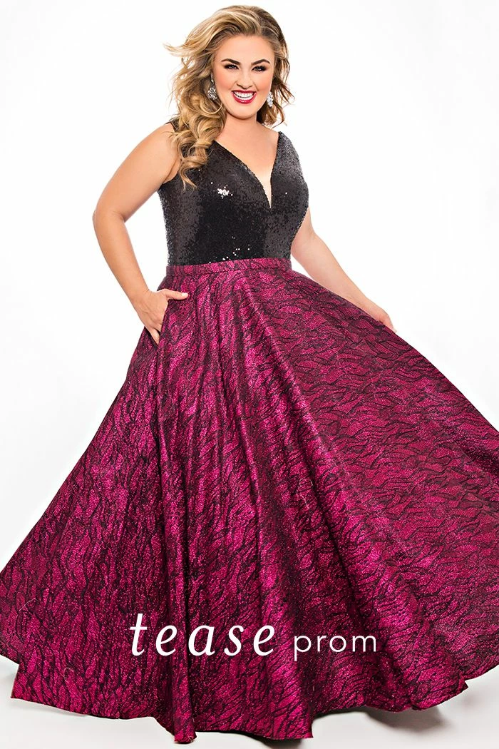 Tease Prom TE2041 size 14 Magenta sequin v neckline print ball gown plus sized prom dress. Claim your share of the spotlight wearing a modern glitter embroidered gown for your 2021 prom or any special occasion. Edgy and trendy the all sequin V-bodice with illusion mesh insert flows into a shimmering embroidered full A-line skirt with pockets. V-neckline with bra-friendly straps flatters all body types while also offering support.  Black/Magenta or Black/Topaz color schemes are always a winning combination for Prom, Holiday balls, and more.Â