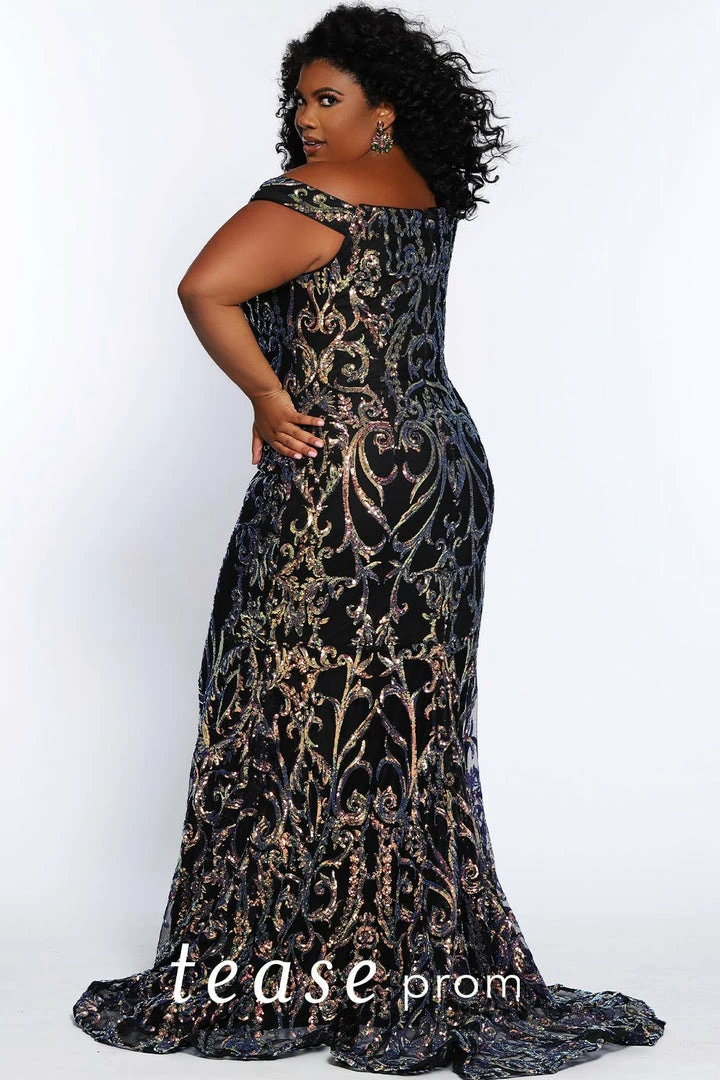Tease Prom TE2105 Prepare for glam girl envy with this stunning mermaid silhouette prom dress in shades gold and peacock. This floor length dress is adorned with embroidered net along the fitted v-neckline bodice and structured off-the-shoulder straps. It’s the ultimate curve hugging look with comfort from the center-back zipper at your natural waistline and stretch knit lining, into a mermaid skirt with train. TE 2105