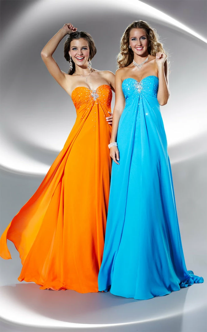 Slim flare chiffon with split overskirt, shirred strapless empire bodice, A/B stone and bead center front broach effect; scatter sequins on bust, sweep train. Chiffon