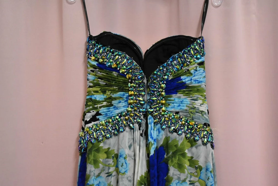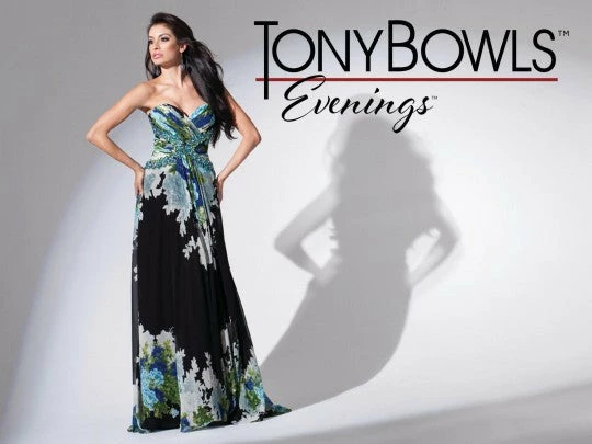 Tony Bowls Evening TBE11548 Beautiful Flowing Printed Chiffon with Elaborate AB Crystal Accents along the bodice.