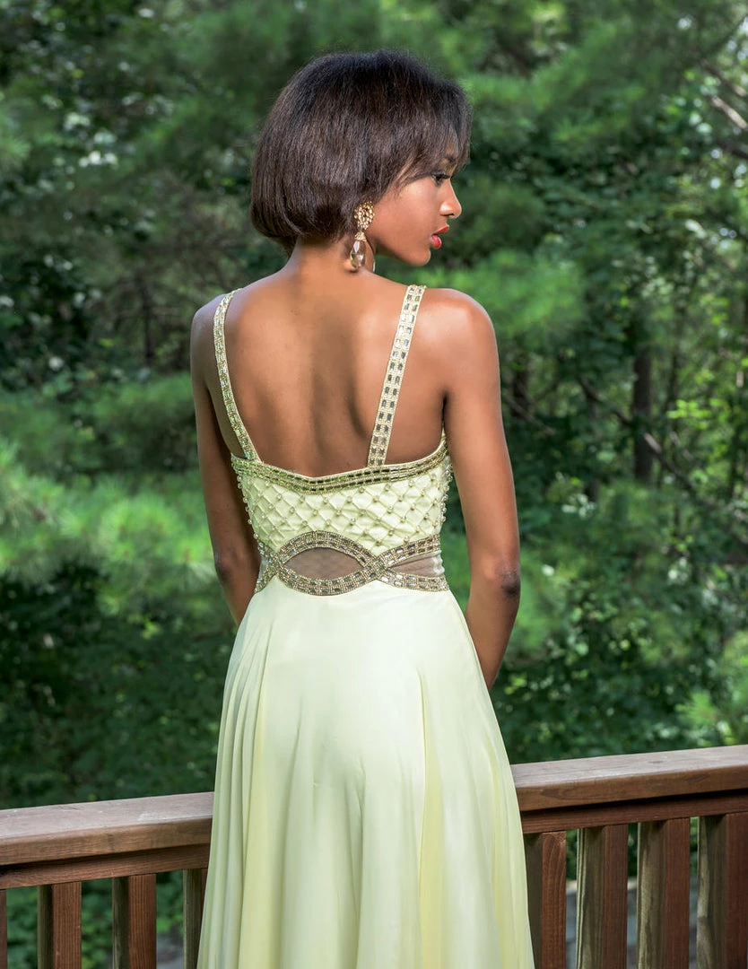 Beautiful fitted chiffon prom dress with a gorgeous beaded pattern on the top.Â
