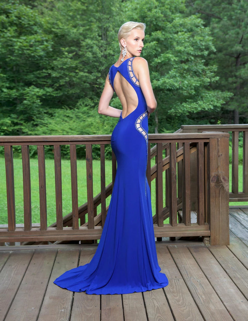 Racy sheer stripe that flows down the sides of this jersey prom dress with a high neckline and cutout back and red carpet train. Prom Dress Pageant Gown