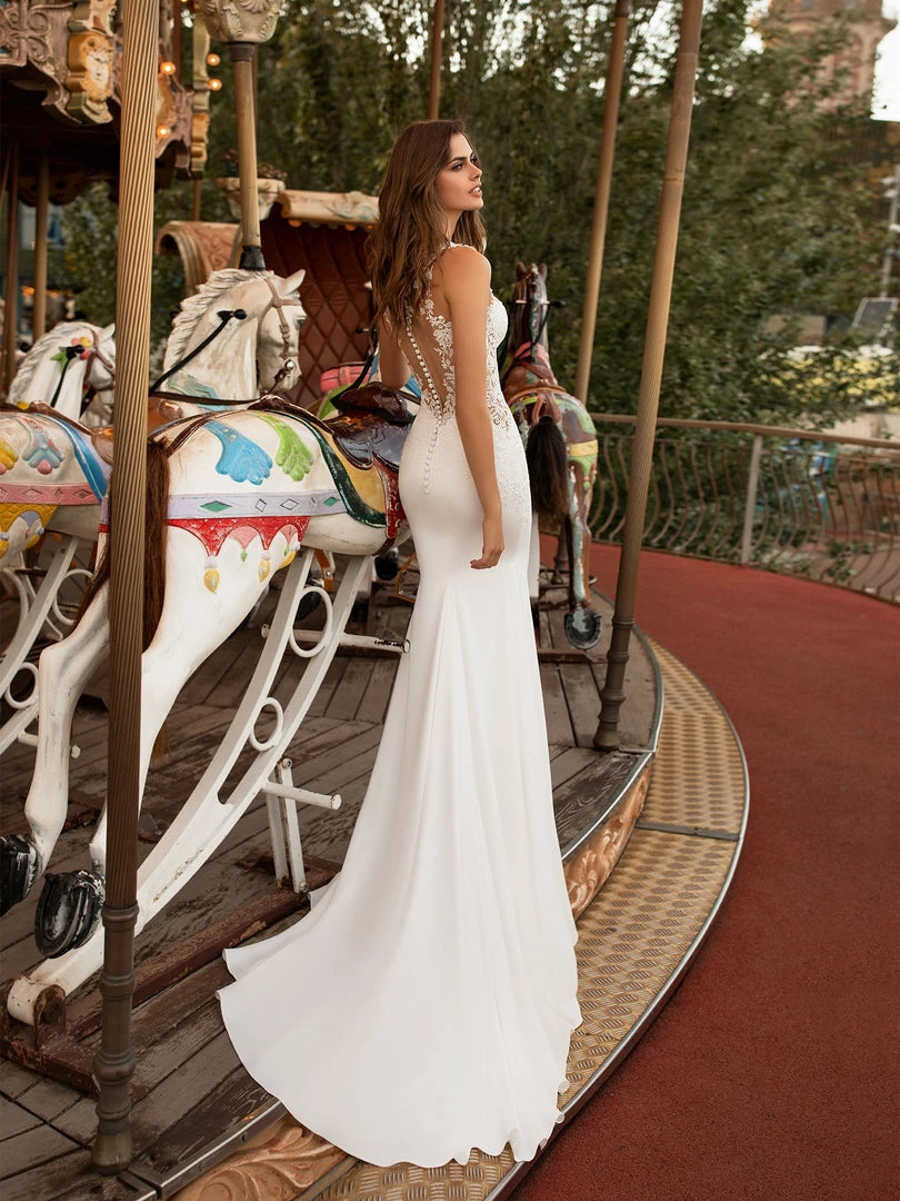 Sensuality at its most feminine was the inspiration for this amazing wedding dress with a mermaid silhouette. A design that uses the most suggestive necklines and details to create a sweetly stunning silhouette: