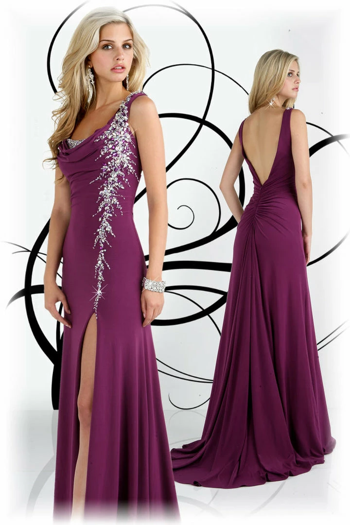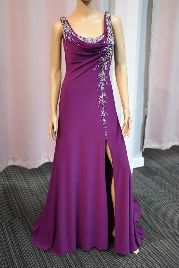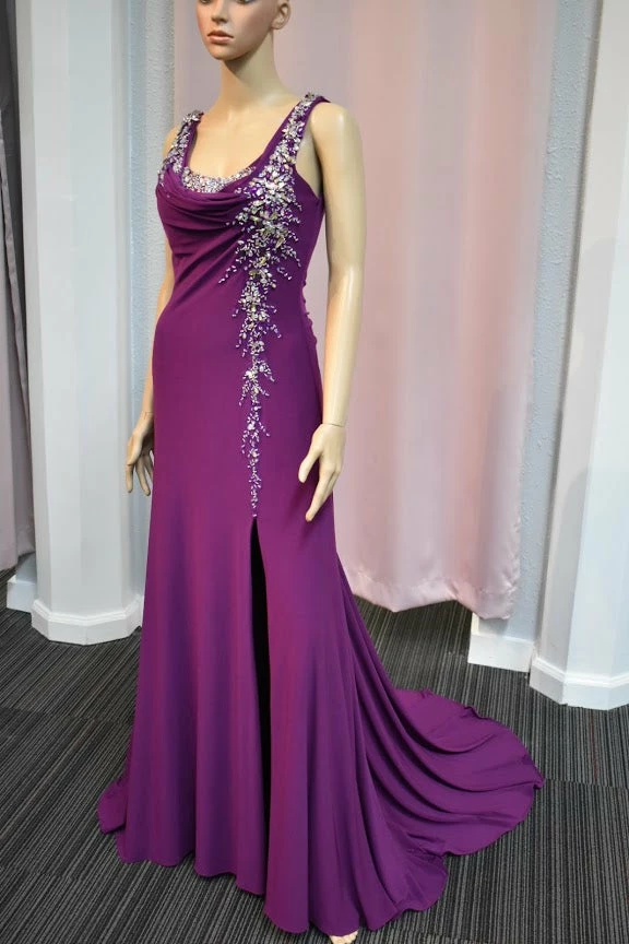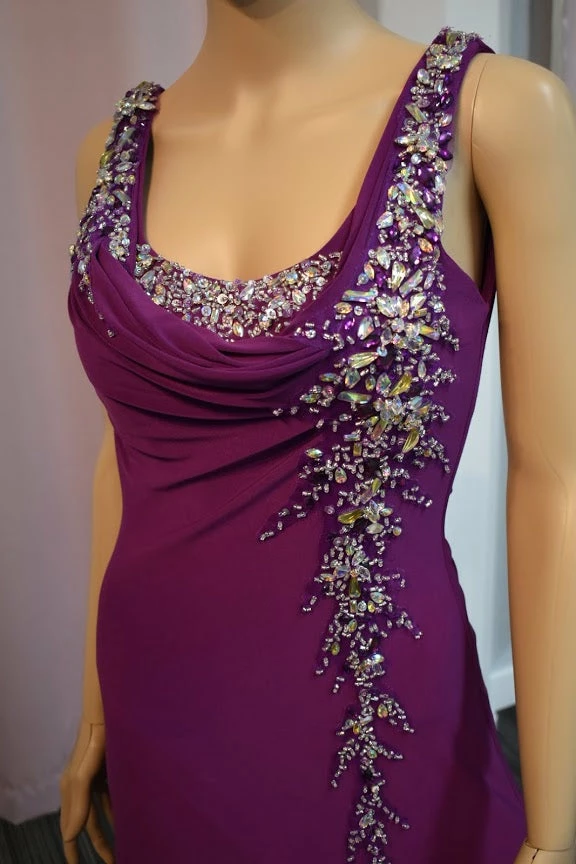 This is a Stunning Xcite Designer Gown available in Violet Size 2. Quality Jersey Material with Stunning Crystal Accent along the bust and side leading to a slit with a train in the back. Perfect for Pageant & Red Carpet. Very stretchy