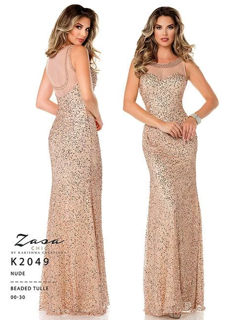 Zasa Chic K 2049 is a long Fitted sequin Embellished Formal Dress with a sheer illusion high neckline and back. Great for plus size. Prom dressÂ