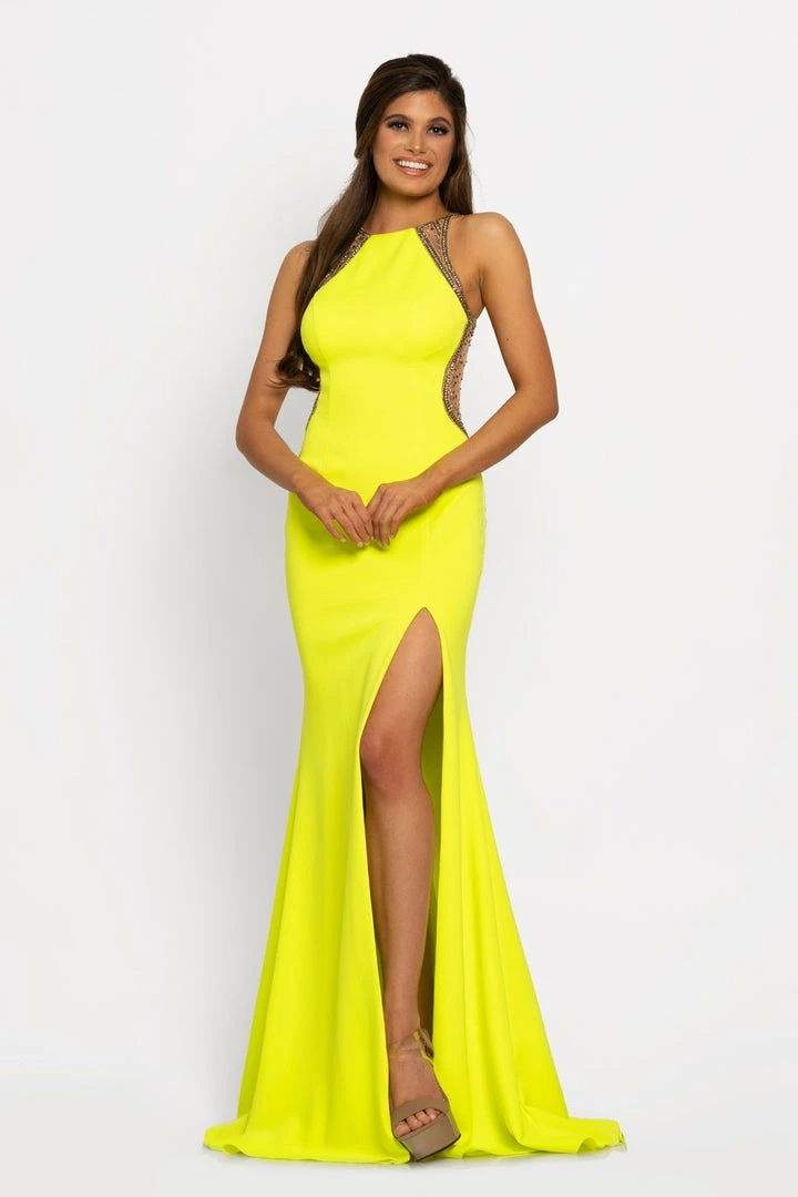 Johnathan Kayne 2023 is a mermaid Prom Dress, Pageant gown & Formal Evening Wear Dress. This Long Fit & Flare Mermaid Prom Dress Features a High Neckline with sheer embellished side cutout and illusion straps. Leading around to a sheer Illusion Embellished Back. Skirt features a slit and sweeping train.