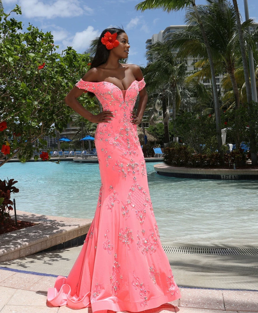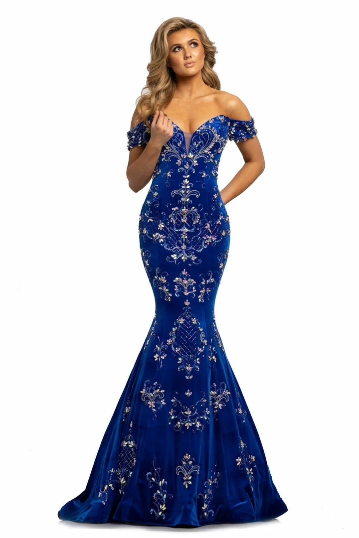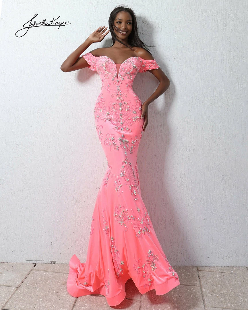 Johnathan Kayne 2176 is a long fit & Flare Mermaid Silhouette Crushed Velvet Formal Evening Gown. This Pageant Dress Features Crystal embellished off the Shoulder sleeves and a sweetheart Plunging neckline. Lush Trumpet skirt with sweeping train. Bodice is embellished with hand beading and crystal rhinestones. Prom Dress Evening GownÂ