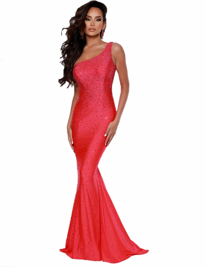 Johnathan Kayne 2318 Prom Dress, Pageant Gown. This is a long embellished prom and pageant dress made of 4 way stretch lycra. It is embellished throughout with hot stones. The asymmetrical neckline is a one shoulder strap. It has a long pageant train.