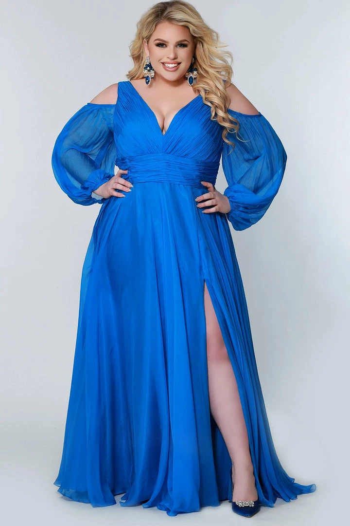 Johnathan Kayne for Sydney’s Closet JK2205Β This flowing chiffon prom dress is perfection in an a line silhouette that captures tons of on trend design features like pouf see through sleeves, cold-shoulder openings, and a pleating along the bodice and waist. Pop that leg with a high slit, and choose from three hot shades of Blue Jay blue, Cardinal red, and Raven black.Β JK 2205