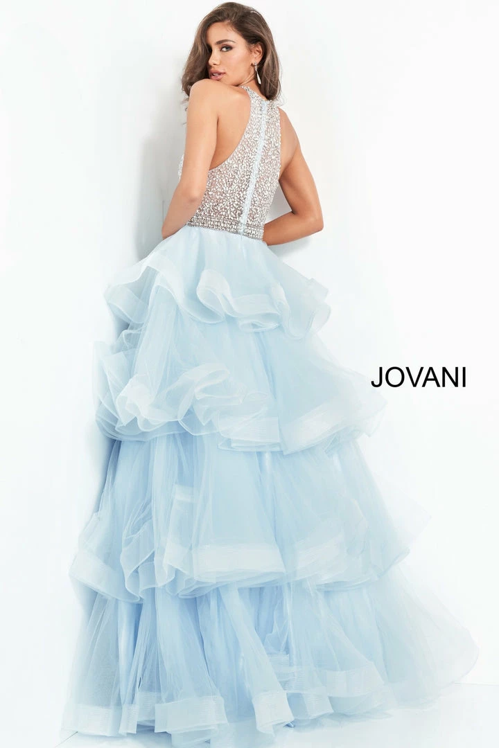 Jovani 00461 long prom party dress features a fully beaded bodice with a jewel neckline, sheer racer back 4-tier tulle skirt has a beaded waistline and finishes with horsehair edging for fuller ball gown volume.