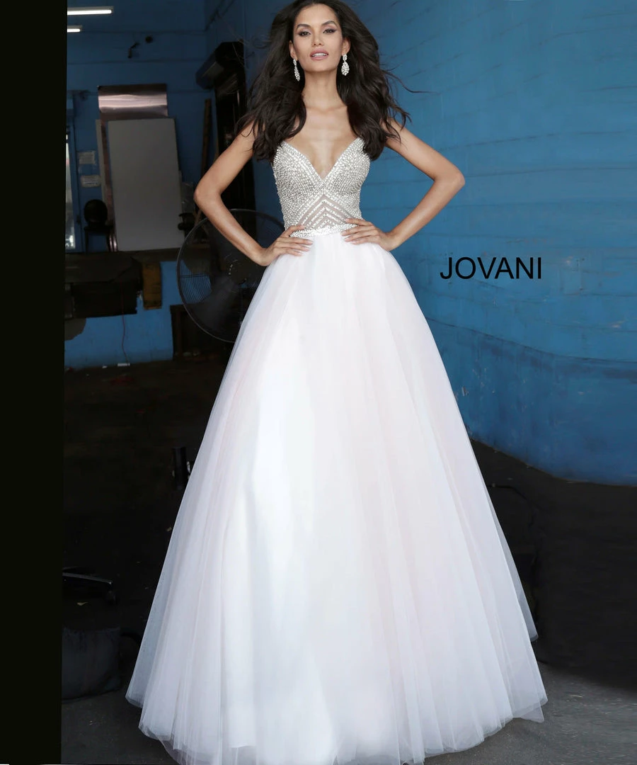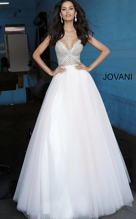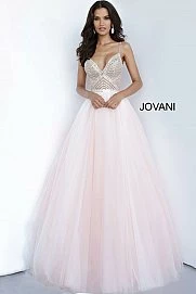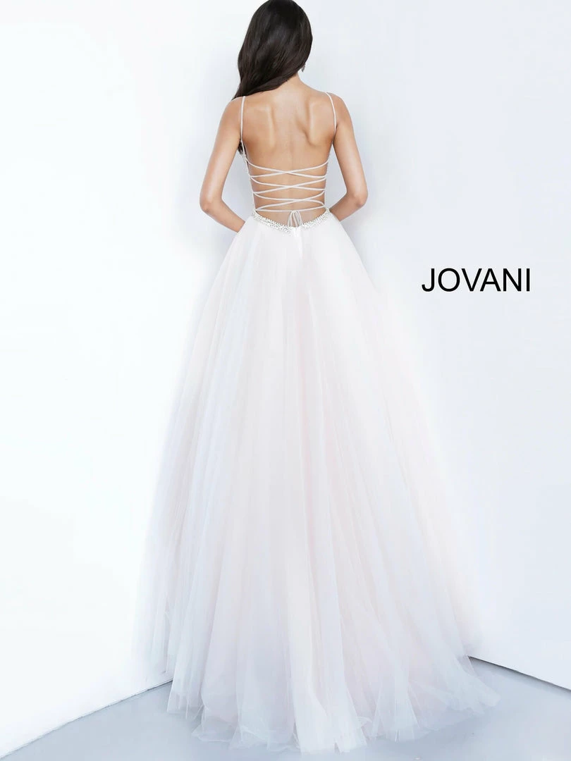 Jovani 00580 Blush beaded v neckline bodice with spaghetti straps tie back tulle A line ball gown prom dress evening gown pageant gown