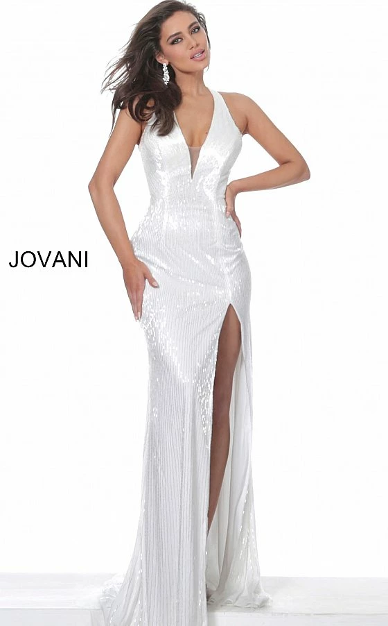 Jovani 00694 fully beaded with linear beads v neckline pageant gown evening dress prom dress with side slit. This evening gown has a large teardrop opening in the back and sweeping train. In ivory makes a sexy wedding dress or reception dress.Â
