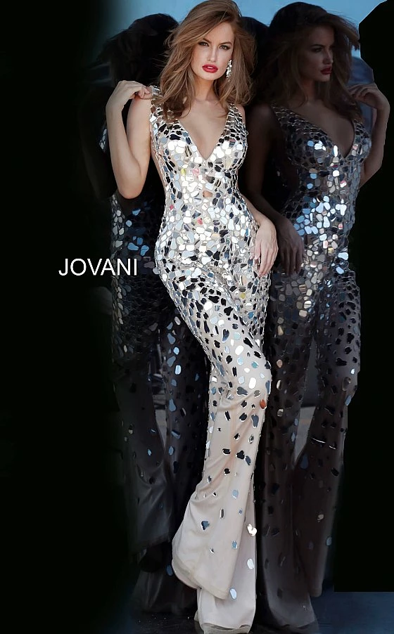 This Jovani 02507 nude sleeveless jumpsuit is fashioned in glass beaded mesh over a solid lining, with plunging V-neckline, sheer side insets, and open V-back. The fitted pants finish in a slightly flared hem. Mirror jumpsuit.Â