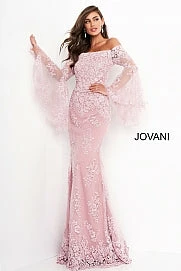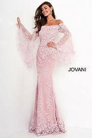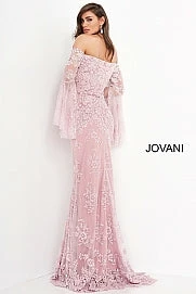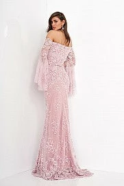 Jovani 02570 Floor length form fitting pink floral embellished evening dress features off the shoulder bell sleeve bodice with straight neck. Formal Evening dress, Mother of the Bride dress.