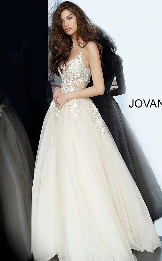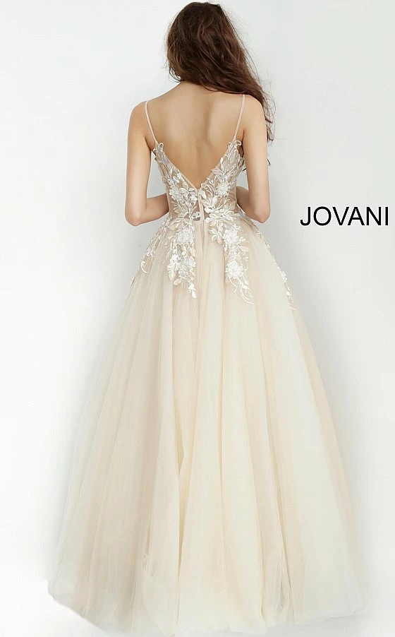 Jovani 02758 v neckline lace applique prom dress ball gown evening dress pageant gown wedding dress A Line Tulle Nude Evening Gown Floral Lace Applique Details cascading from the v neckline and open v back.  Long Sheer Lace Applique A Line Prom Dress Pageant Gown Formal