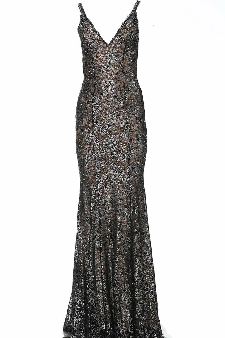 - Details: Metallic lace, fully lined, heat set stones, form fitting silhouette, floor length, sleeveless bodice, V neckline, straps over shoulders, low back.