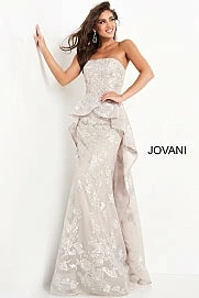 Jovani 02966 Floor length form fitting silver embroidered embellished evening dress with high low peplum overskirt features strapless bodice with straight neckline. Formal Evening Wear Gown, Mother of the Bride Dress.