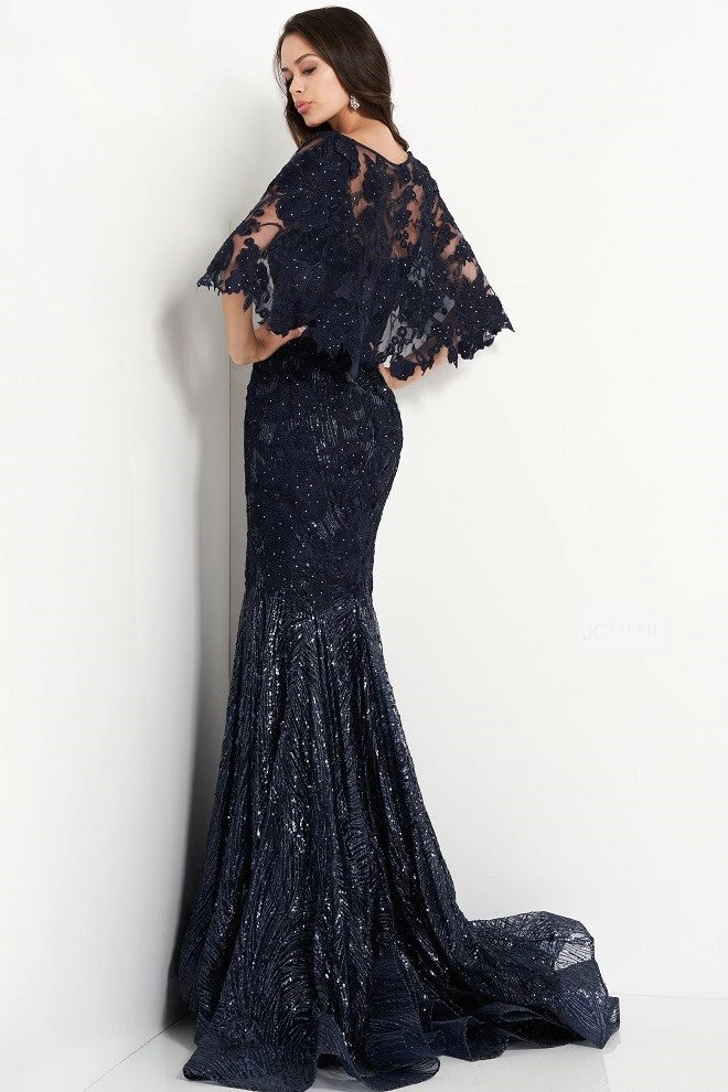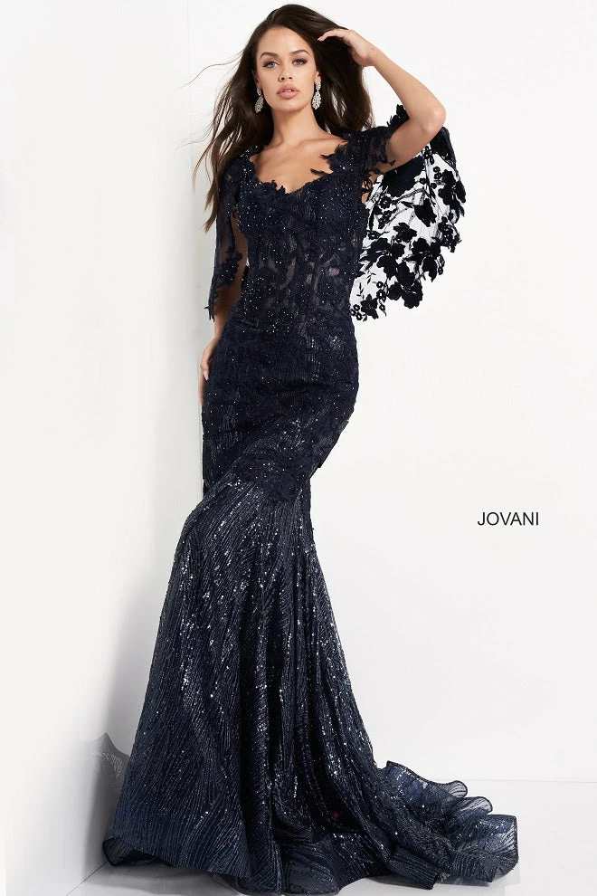 Jovani 03158  This navy formal evening gown features a form-fitting silhouette in glitter net, with beaded floral embroidery cape sleeves. Corset boning bodice tapers the illusion sweetheart neckline, offset with back godets that spill to a horsehair hem and sweep train. Formal Evening Wear Gown, Mother of the Bride Dress