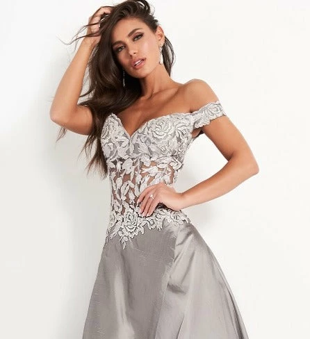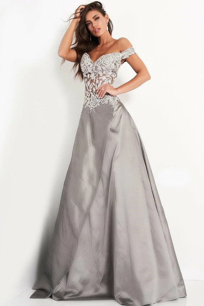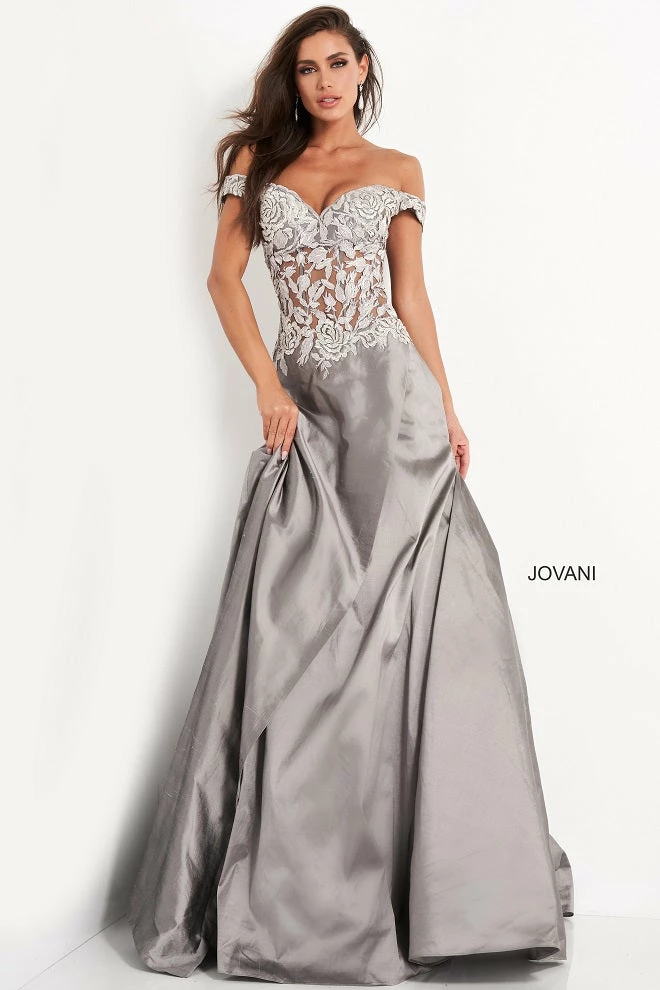 Jovani 03369 Floor length A line grey evening dress features pleated silk skirt and off the shoulder embroidered lace bodice with sweetheart neckline. Formal Evening Wear Dress, Mother of the Bride, Mother of the Groom