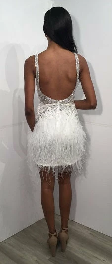Jovani 04042 is a stunning Sheer Embellished & Beaded fitted bodice with a plunging neckline & an open Scoop back. This short fitted cocktail dress features lush feathers flowing around the embellished short skirt and around the hips. Great for a sexy wedding reception gown or for your next Formal Events! Prom, Pageant, Red Carpet & More!