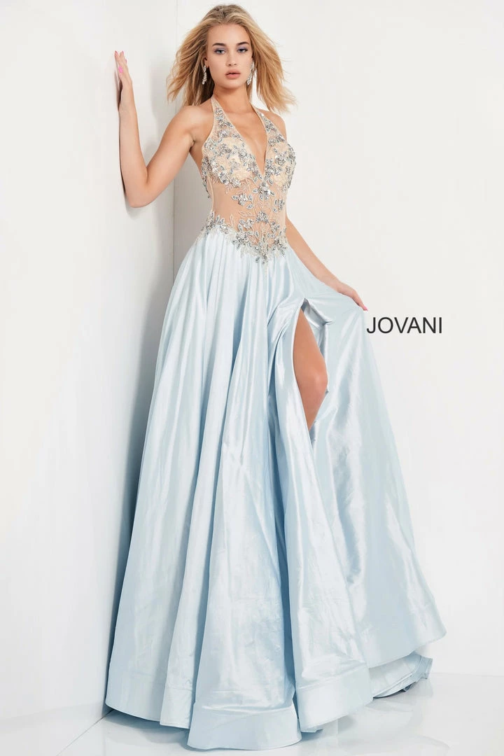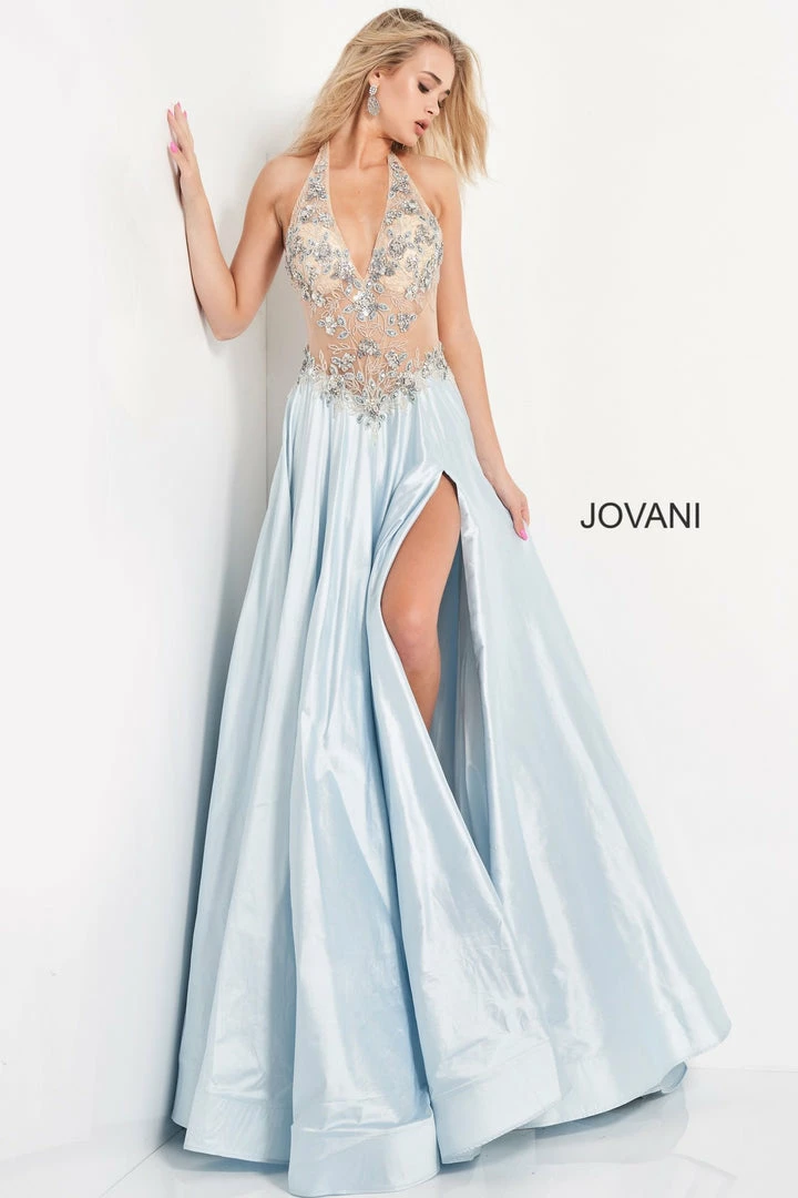 Jovani 05587 light blue long party dress features a beaded lace-appliqued illusion bodice with a plunging halter neckline and a low illusion back. The basque waist gives way to the taffeta ballgown skirt, finished with a thigh-high slit and a court train.