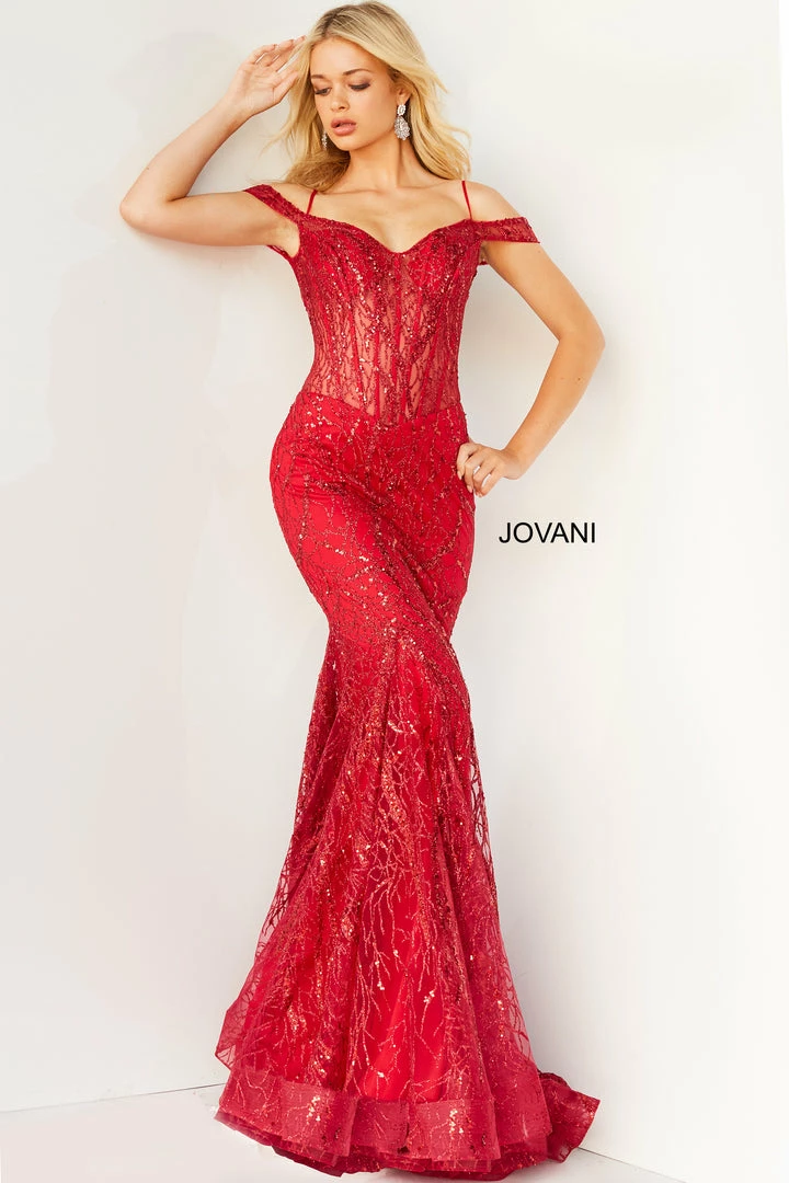 Jovani 05838 Long Mermaid Prom Dress Pageant Gown Formal Dress Corset off the shoulder Glitter embellished sheer mermaid.