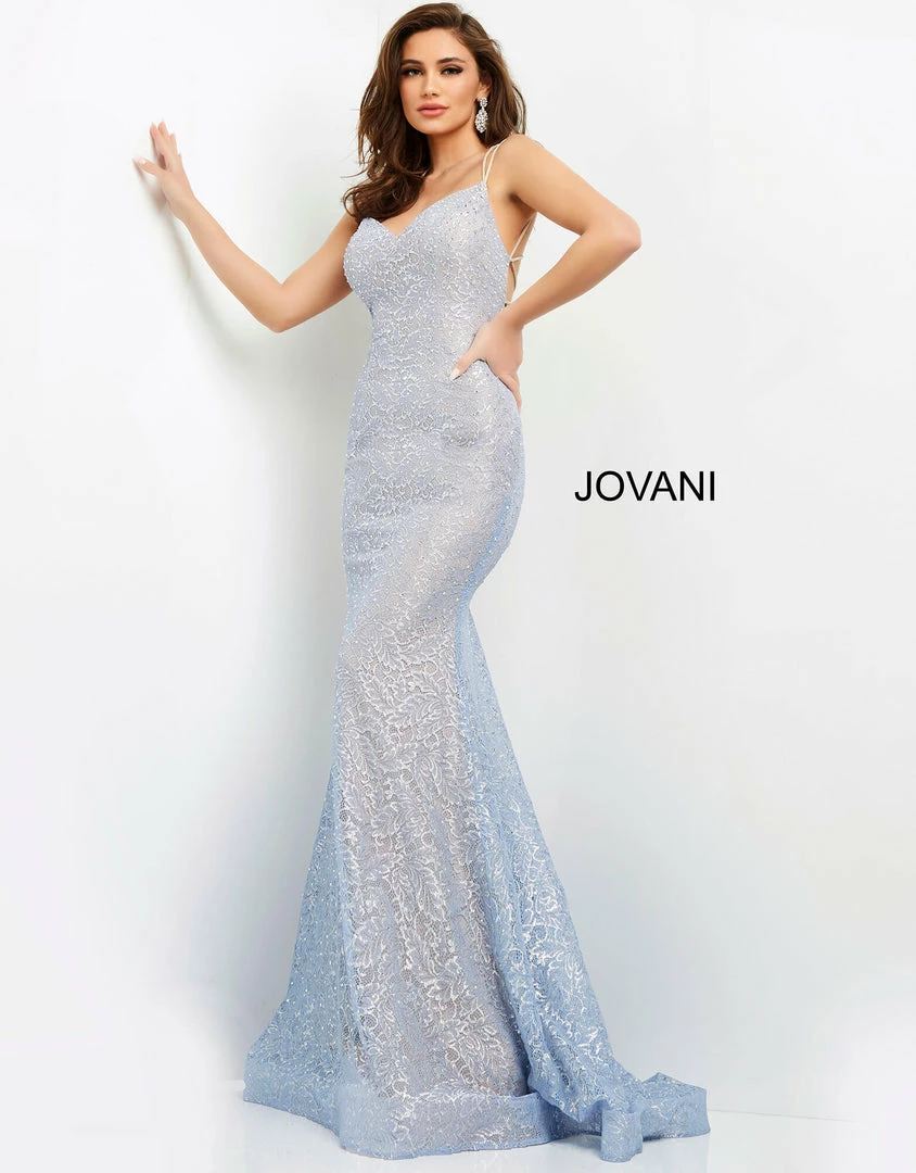 Jovani 05942 This is a long light blue prom dress with a modest V neckline and spaghetti straps that cross and tie in a open corset style. The floor length skirt on the formal evening pageant gown is flared at the end and has a sweeping train.