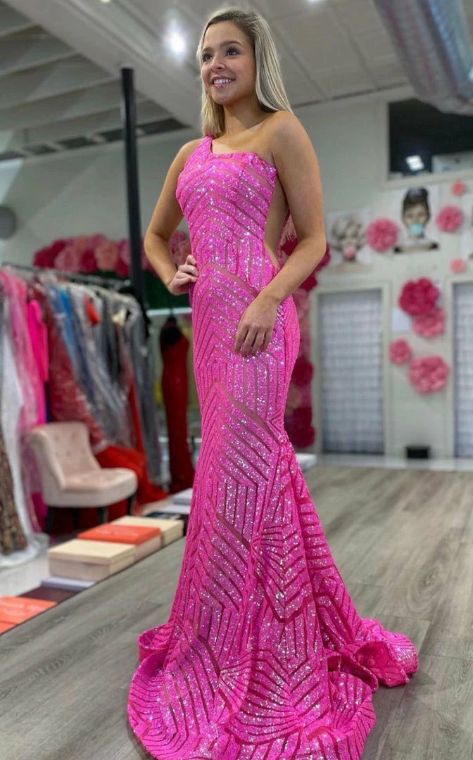Jovani 06017 Long Mermaid Prom Dress.  This Jovani 06017 prom gown features a fit and flare silhouette in geometric sequins, detailed with a one-shoulder neckline and sheer plunging sides. Soft godets add volume to this glitter formal dress, finished with a horsehair hem and lush sweeping train.