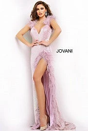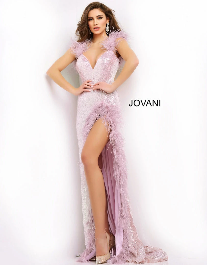 Jovani 06164 This extravagant Prom, Pageant and Evening Gown has a Plunging neckline with feather details on the straps and surrounding the high thigh side slit. The long prom dress has sequins throughout and has a sexy open back. Â