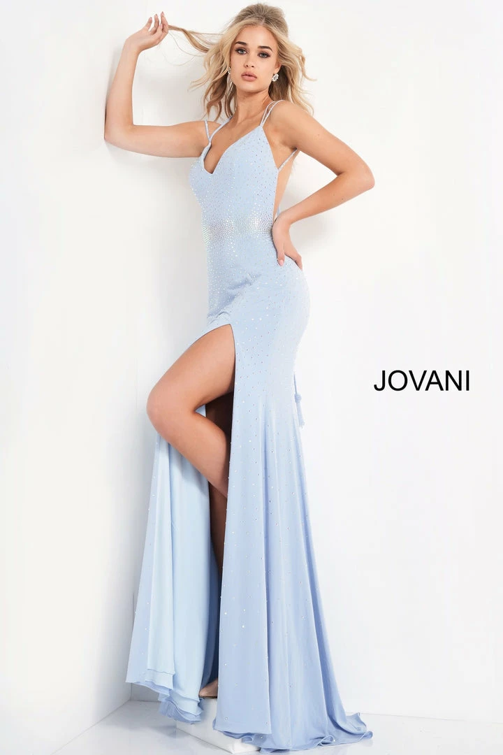 Jovani 06209 This is a long stretch jersey embellished evening gown with a v neckline. This prom dress is backless and has a high side slit.
