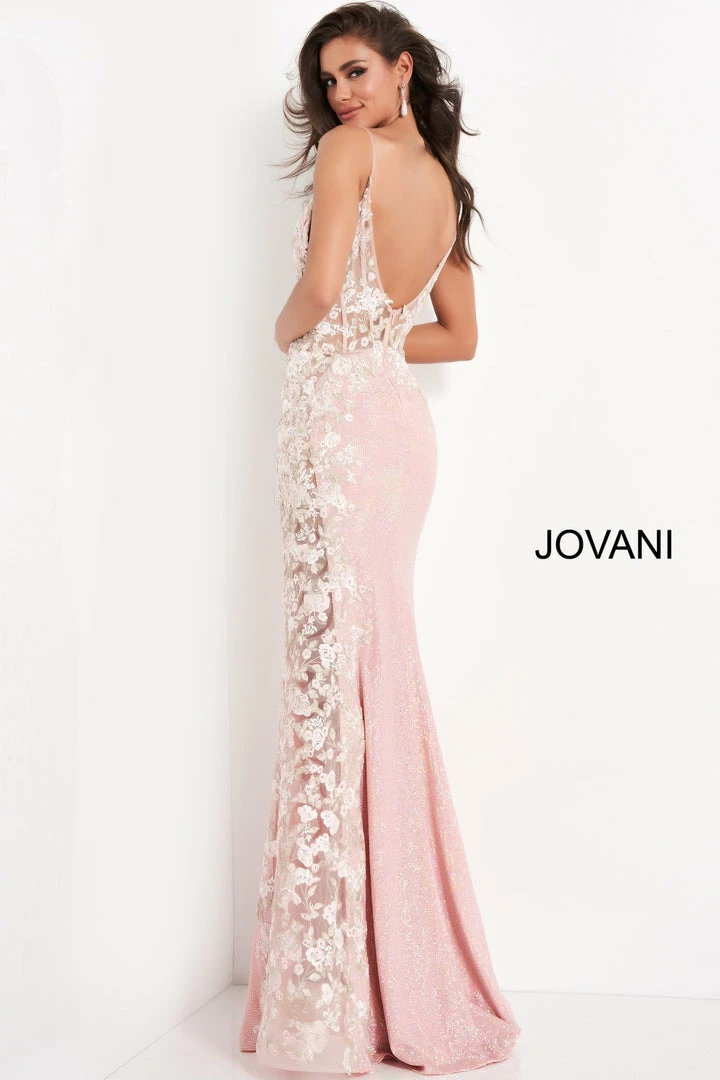 Jovani 06232 is a long fitted pink sequin Formal evening gown. Featuring a Gorgeous Sheer Corset Style fitted bodice with boning. V neckline. This Prom dress is accented with floral appliques embellished & Cascading from the bodice down into the sheer side panel that runs the length of this pageant gown. Backless. Sequin embellished skirt. Great sexy gown for any formal event!