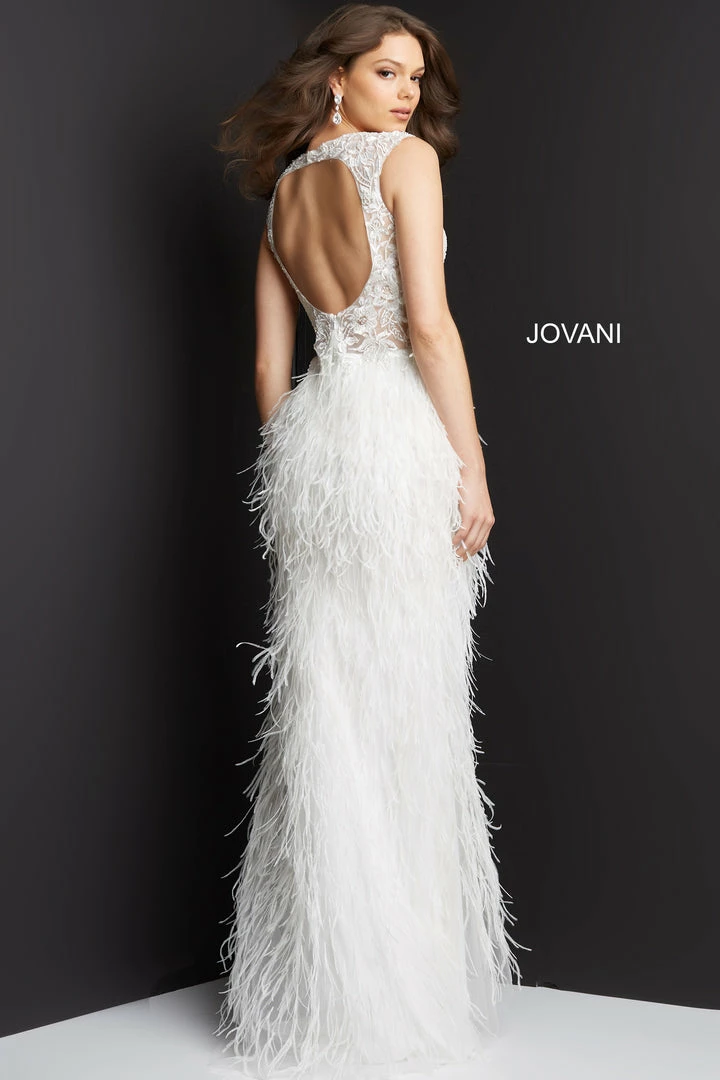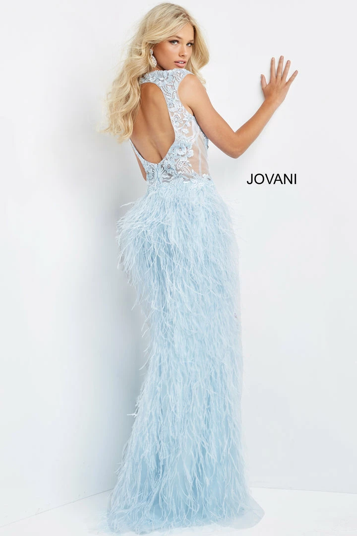 Jovani 06446 Long FeatherΒ Prom Dress Pageant Gown Sheer Embroidered Bodice Backless Slit