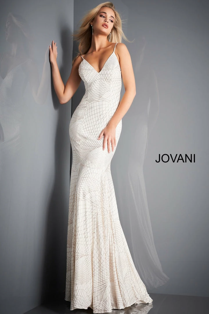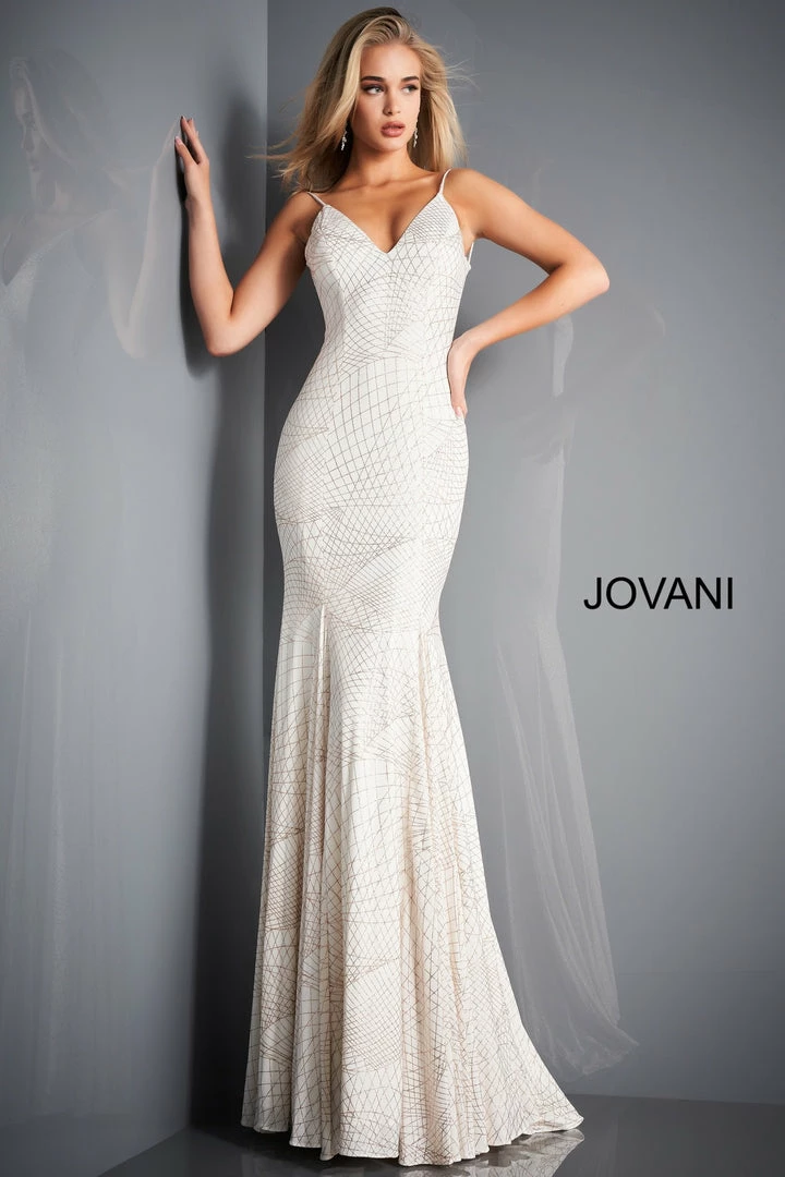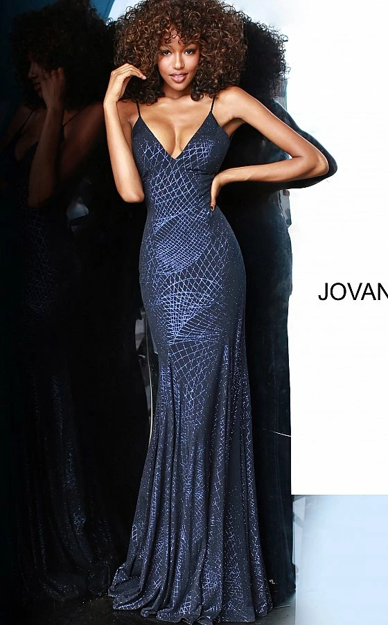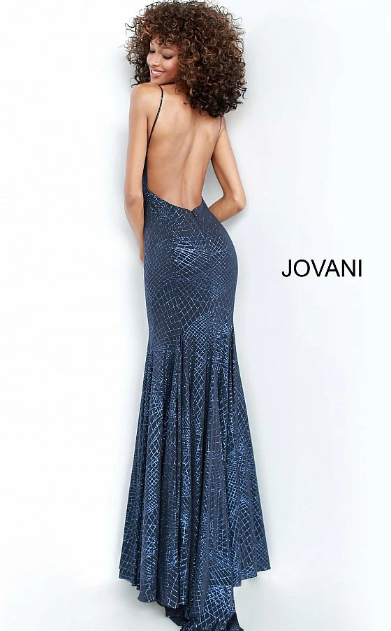 Jovani 1120 is a Stretch glitter long fitted prom dress, evening gown & Formal wear. Featuring a deep V Neckline with wrap around spaghetti straps this backless form fitting dress flares at the skirt for a fit & Flare silhouette and small sweeping train.Â