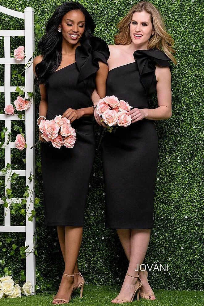 Jovani 23886 Â Elegant three quarter length scuba fitted bridesmaid or cocktail dresses feature one shoulder neckline with a ruffle detail.