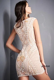 Jovani 2662 Short form fitting white multi embellished cocktail dress features cap sleeve bodice with boat neckline and close back.
