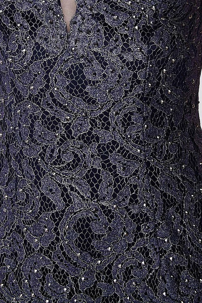 Beautiful gunmetal grey cap sleeve lace dress features artfully crafted crystal embellishments