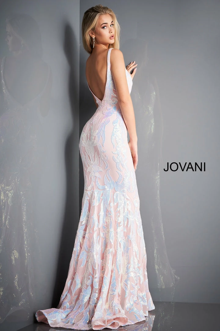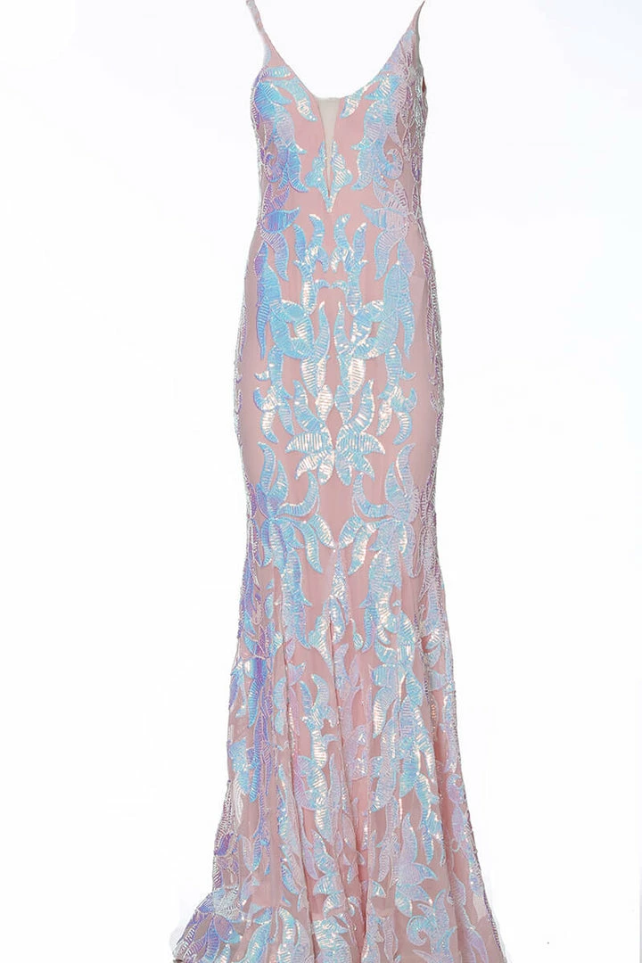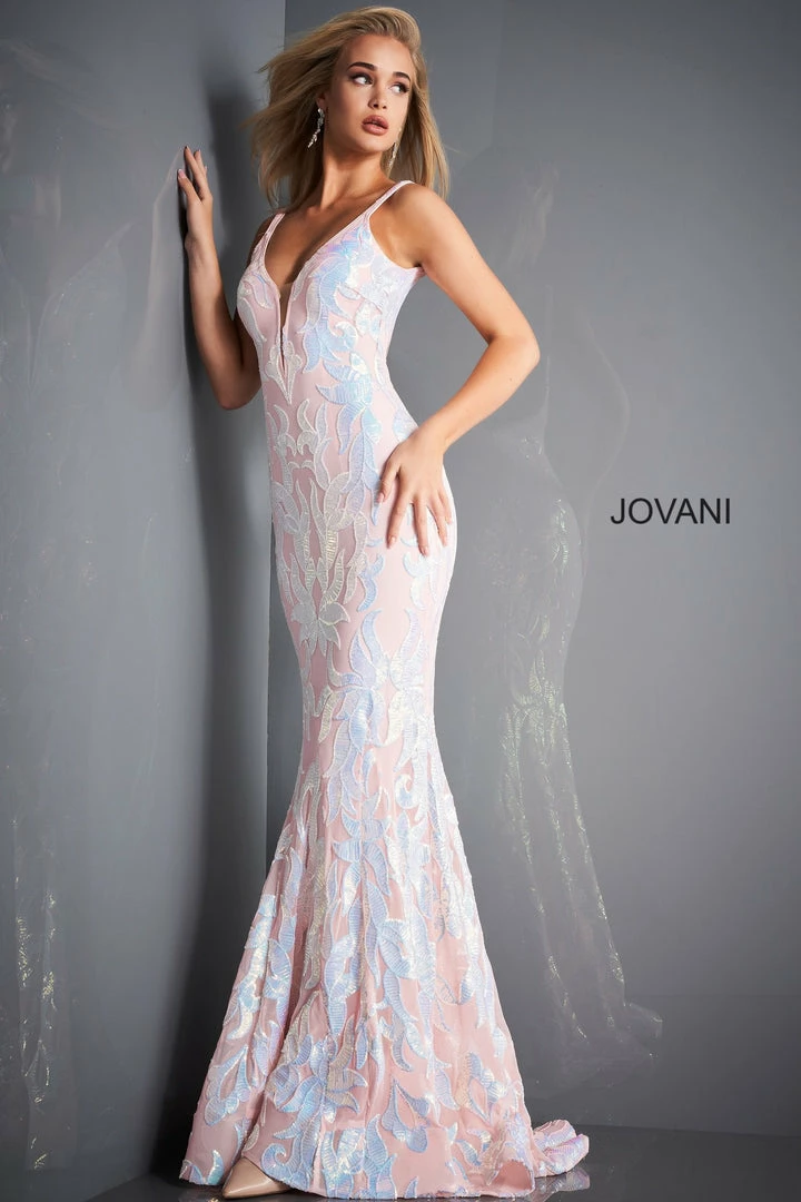 Jovani 3263 is a long Fitted Mermaid Prom Dress with a damask print sequin embellished pattern. Plunging V Neckline and open V Back. Lush Trumpet Skirt is great for the stage in this formal evening gown & Pageant Dress.
