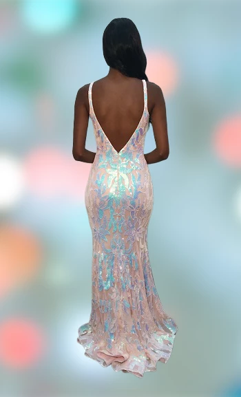 - Details:Â Sequin embellished stretch fabric, form fitting silhouette, floor length, sleeveless bodice with straps over shoulders, plunging neckline, open back.