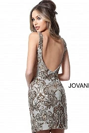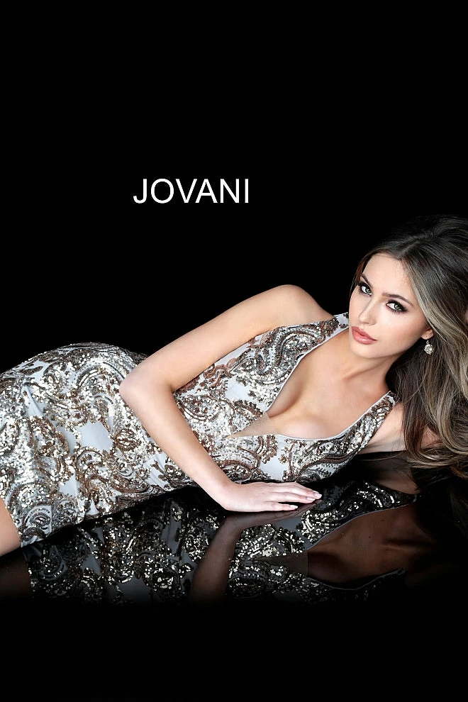 Jovani 3414 Gold Silver Low V Neck Sleeveless Sequins Fitted Cocktail Dress