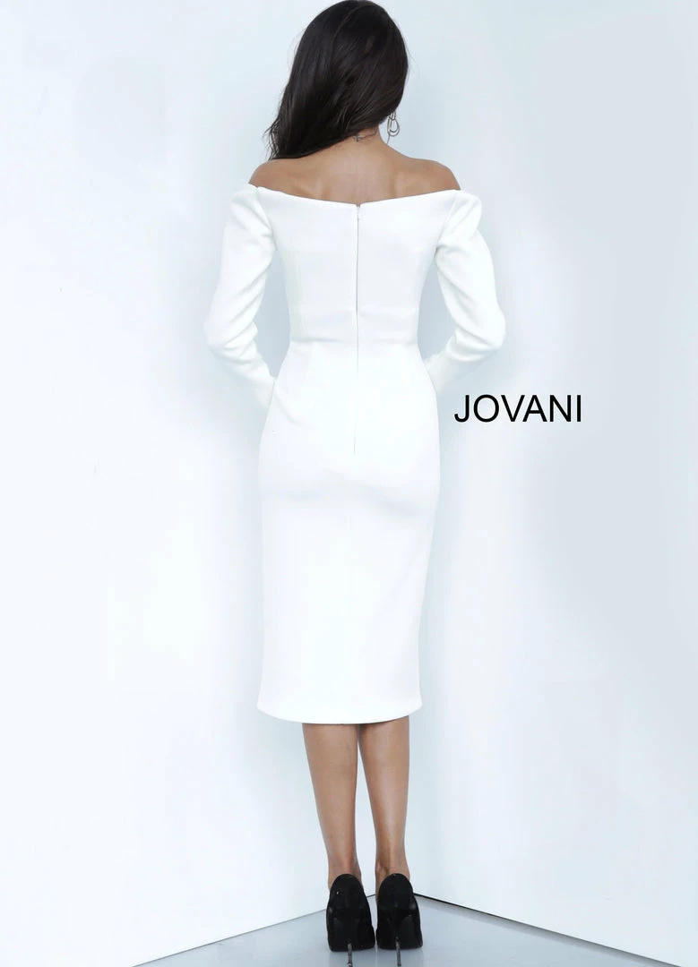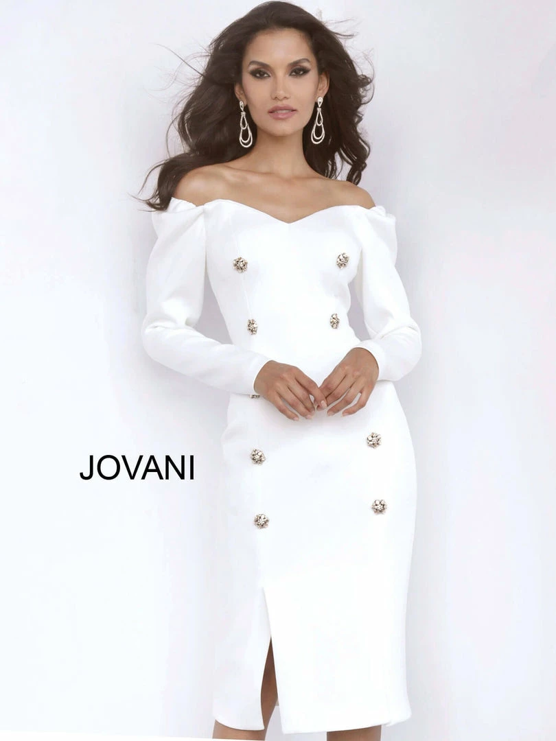 Jovani 3570 sweetheart neckline off the shoulder long sleeves fitted knee length cocktail dress Form fitting scuba double breasted cocktail dress, knee length skirt with double front slit, off the shoulder bodice with long sleeves and sweetehart neckline.