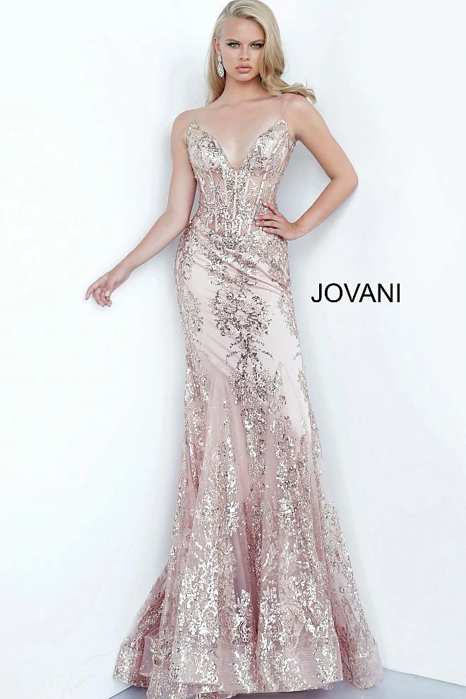 - Details: Embellished form fitting prom dress, floor length with slightly flare bottom, sheer bodice with boning, sleeveless, plunging neckline, spaghetti straps over shoulders, V back. Prom Dresses, Pink Prom Dresses, Corset Dresses, Illusion Dresses, Mermaid Prom Dresses, Sequin Prom Dresses, Sexy Prom Dresses, V Neck Prom Dresses, Long Prom Dresses, Blush Dresses