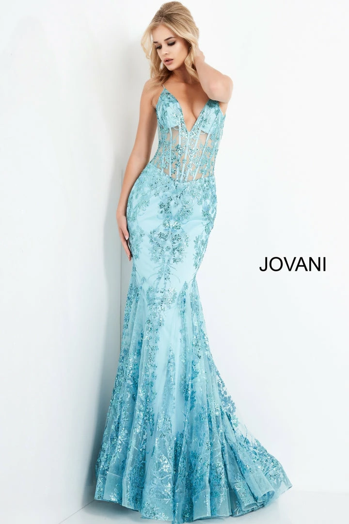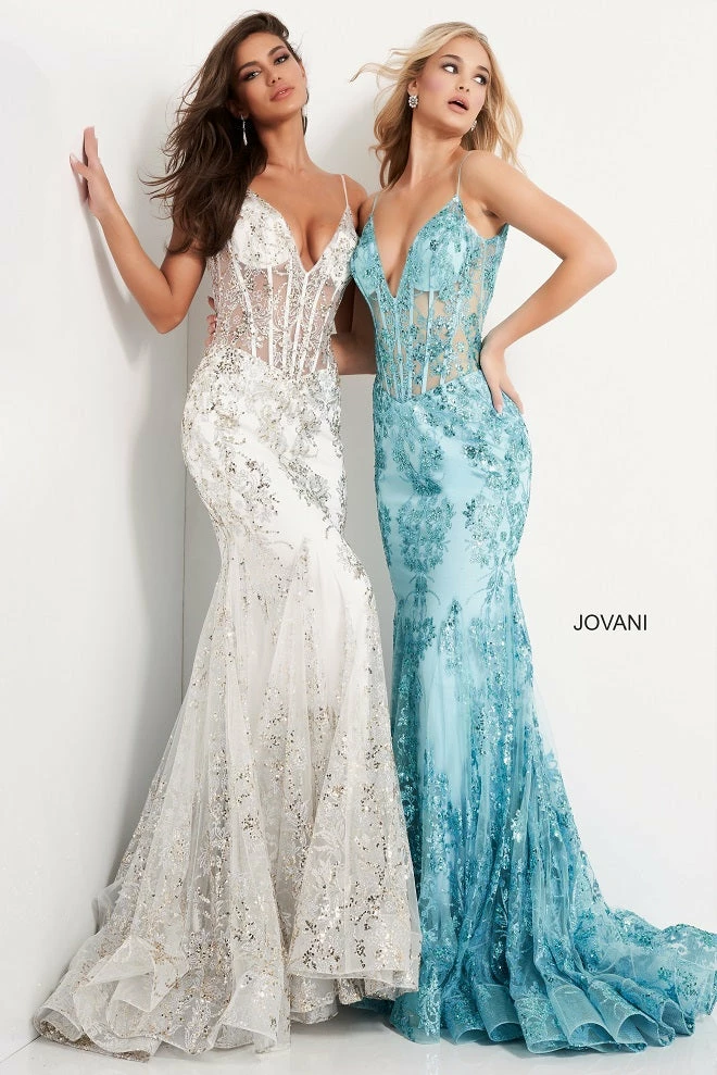 Jovani 3675 Prom Dress. Shine like a Diamond in Jovani 3675! This Gown Features an Embellished Sheer Corset Style Bodice with a Deep V Neckline. Mermaid Silhouette with a Glitter & Crystal Overlay on Tulle.Â