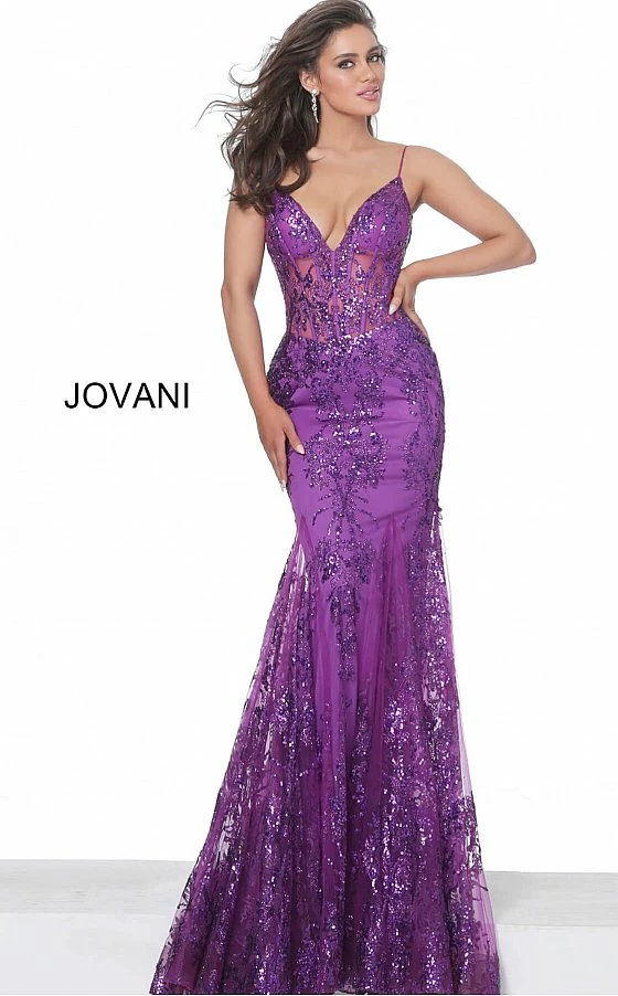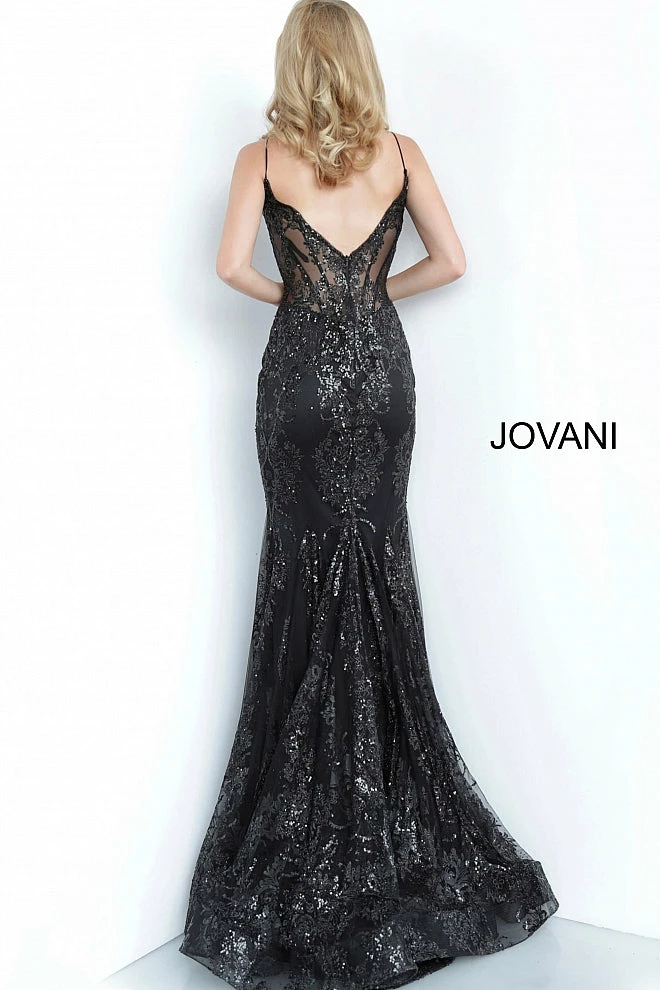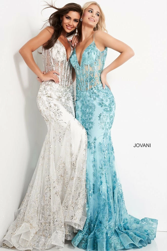 Jovani 3675 Prom Dress. Shine like a Diamond in Jovani 3675! This Gown Features an Embellished Sheer Corset Style Bodice with a Deep V Neckline. Mermaid Silhouette with a Glitter & Crystal Overlay on Tulle.Â
