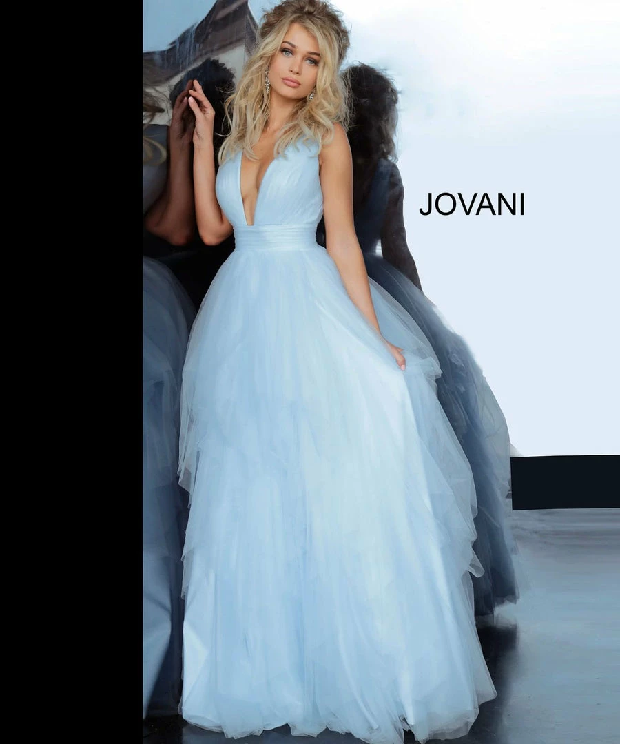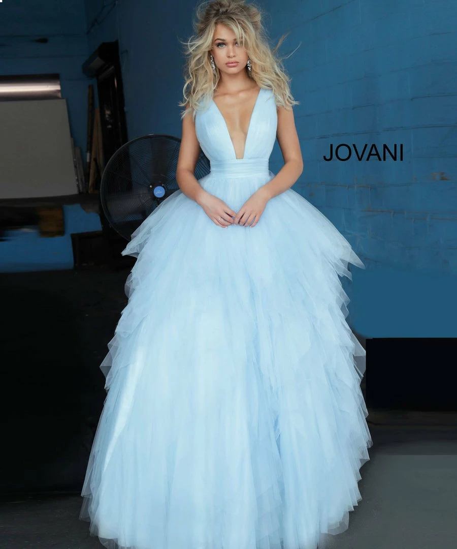 Jovani 3928 plunging neckline with wide straps layered tulle ball gown prom dress evening gownÂ
