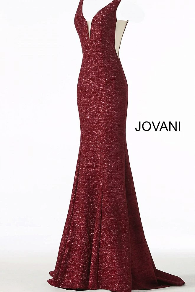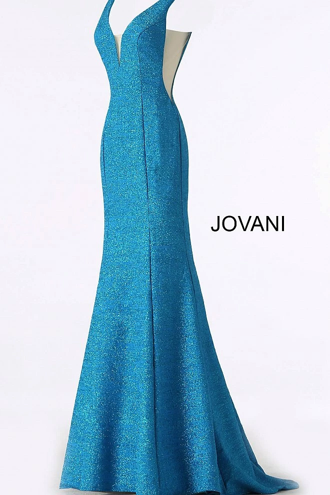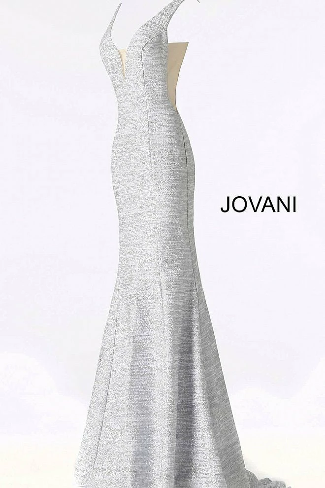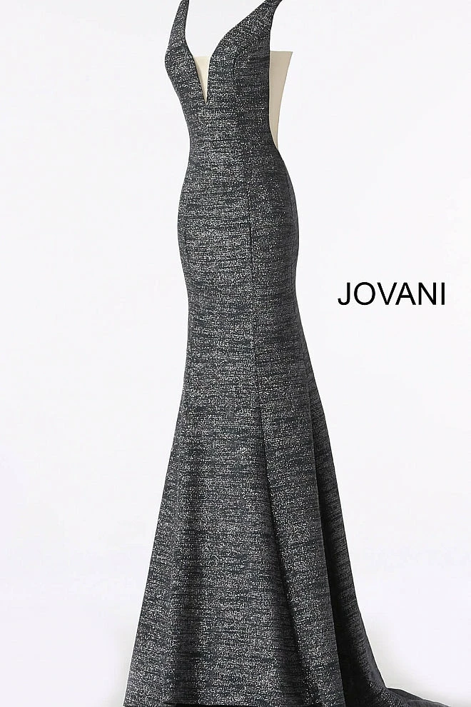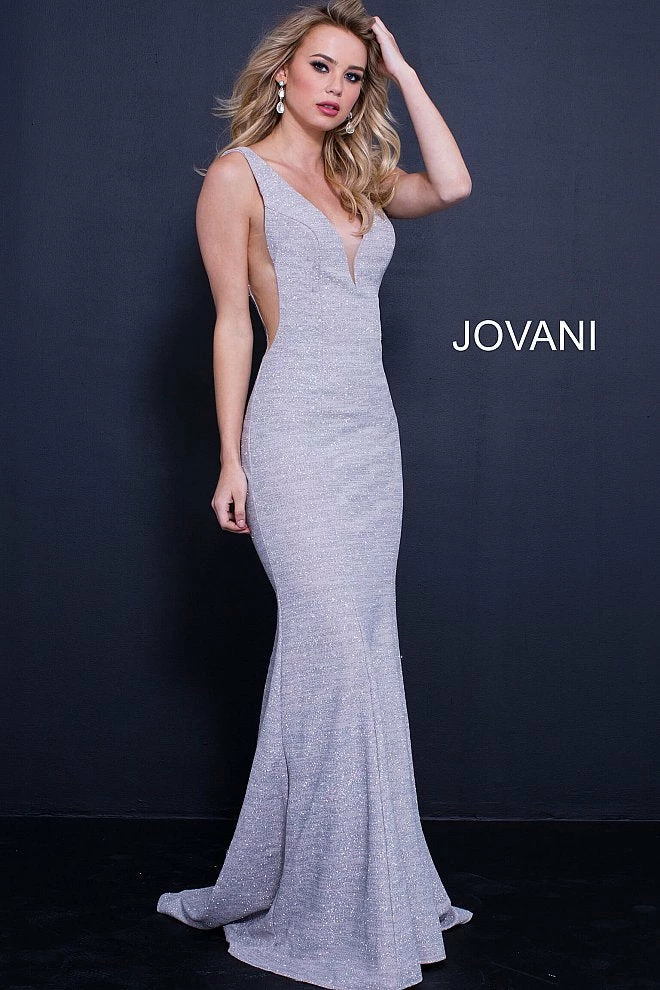 Jovani 45811 Glitter stretch jersey prom dress with plunging neckline, sheer cut outs under the arms and sweep train. Form fitting, backless, mermaid bottom and horsehair trim and sweeping train, sleeveless, plunging neckline with sheer mesh insert, sheer mesh side panels. Prom Dress, Pageant Gown & Formal Evening Wear.