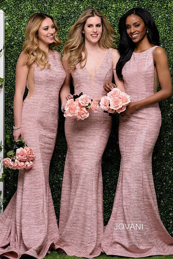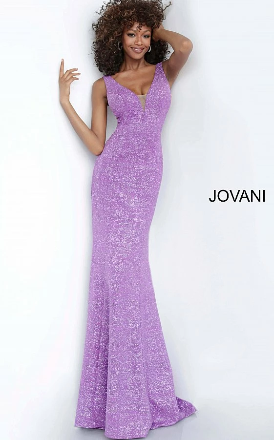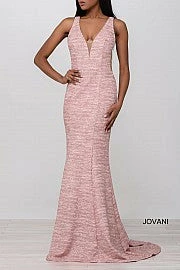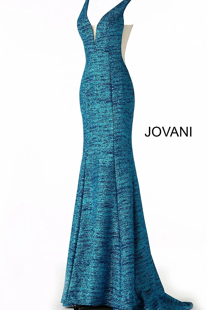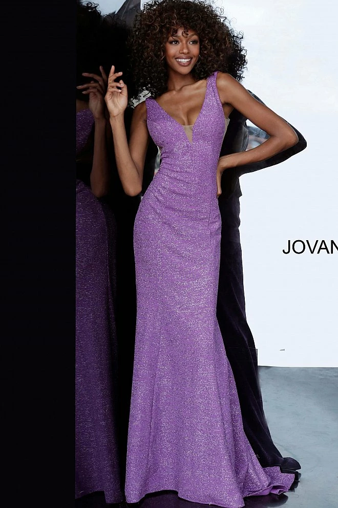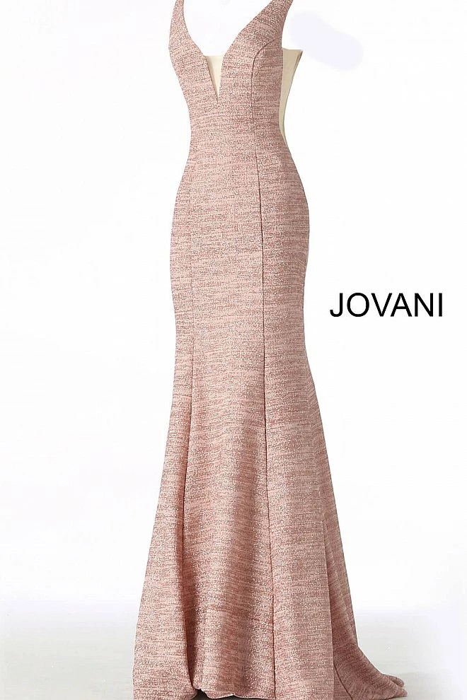 Jovani 45811 Glitter stretch jersey prom dress with plunging neckline, sheer cut outs under the arms and sweep train. Form fitting, backless, mermaid bottom and horsehair trim and sweeping train, sleeveless, plunging neckline with sheer mesh insert, sheer mesh side panels. Prom Dress, Pageant Gown & Formal Evening Wear.